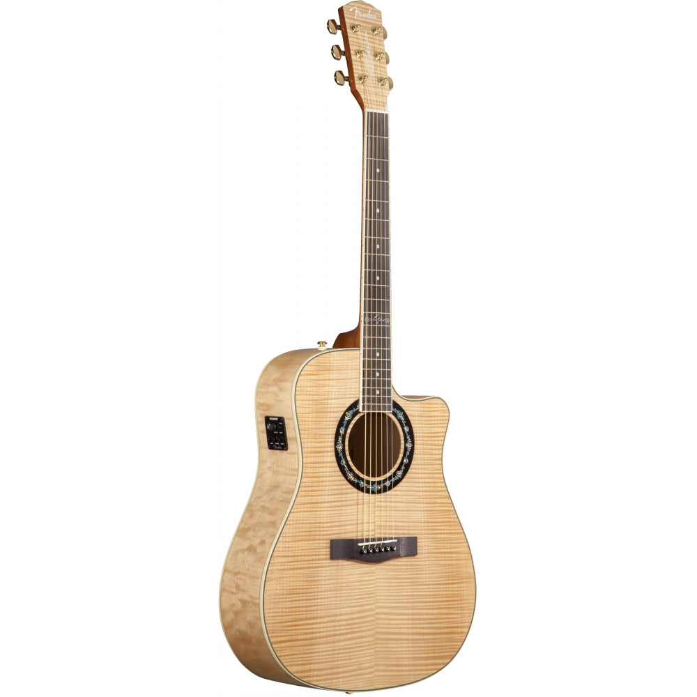 Модель T-Bucket 400CE имеет элегантный внешний вид, она комфортна при игре, а главное – выдаёт узнаваемый фендеровский акустический звук, идеально подходящий для настоящего рока. Корпус дредноут с одним вырезом обеспечивает удобный доступ ко всем ладам. Высококачественная электроника позволяет получить богатое и насыщенное, при этом чистое и чёткое, очень естественное звучание с прекрасным резонансом. Верхняя дека гитары выполнена из ламинированного огненного клёна, обладающего красивой эффектной фактурой. Корпус – из ламинированной древесины гревиллеи крупной (лайсвуд) родом из Австралии. Гриф профиля С – из трёх кусков ламинированного клёна. Окантовка корпуса и грифа – черепаховая, отделка - глянцевая. Накладка – палисандровая с инкрустацией на 3, 5, 7 и 9 ладах и оригинальной инкрустацией «F» на 12 ладу. Порожек - Graph Tech® NuBone™. Звукосниматель с активным предусилителем Fishman® Isys III оснащён трёхполосным эквалайзером, он обеспечивает безупречный звук при игре с подключением и широкие возможности настройки. Встроенный тюнер удобно расположен таким образом, что Вы всегда видите его при игре. Представленная модель выполнена в элегантном натуральном цвете, без пикгарда. На инструменте установлены струны Dura-Tone® 880L толщиной .012-.052.