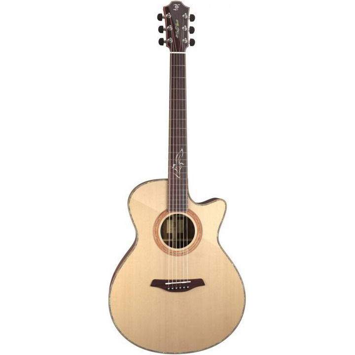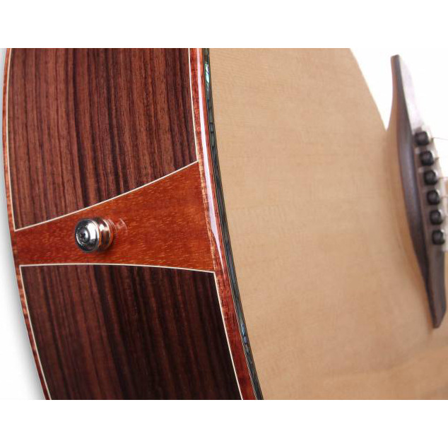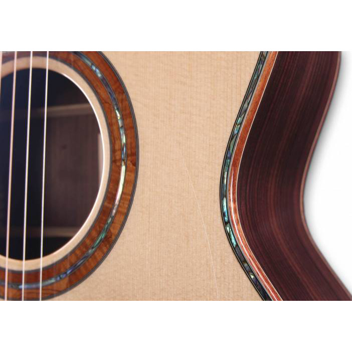 Верхняя дева выполнена из ситхинской ели высочайшей категории, а нижняя дека и обечайка сделаны из индийского розового дерева. Красота и акустические свойства премиальной древисины подчеркиваются многочисленными деталями - розетка с из массива коа с инкрустацией зеленым абалоном, коа также используется на окантовке корпуса, грифа и голове грифа, накладка на гриф и бридж из зирикота. Инкрустация на грифе в виде лист из белого перламутра, похожая форма украшает и голову грифа, но выполненна из зеленого абалона.