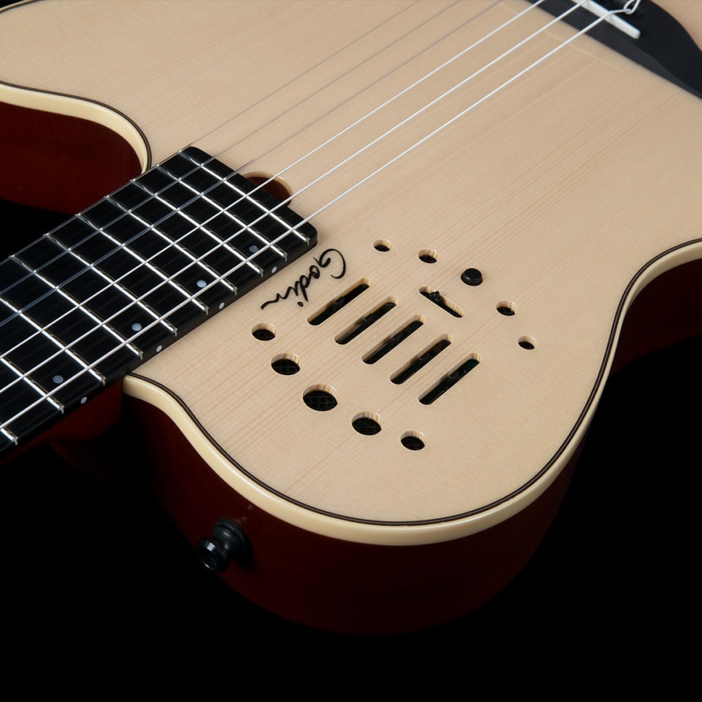 У гитары Multiac Duet Ambiance нейлоновые струны, мензура 647мм и узкий верхний порожек, что значительно облегчит переход с электрогитары со стальными струнами. Модель имеет полый корпус из красного дерева, верхнюю деку из массива ели, предусилитель с контролем обратной связи и звукосниматель под нижним порожком.