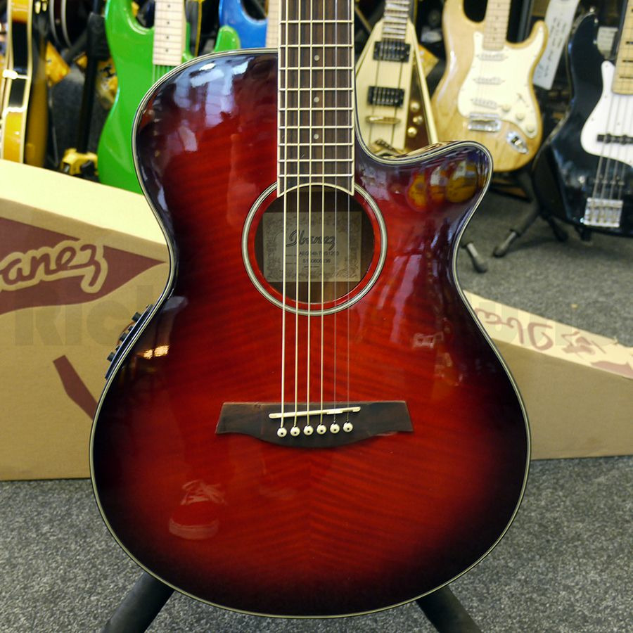 IBANEZ AEG24II-THS - гитара электроакустическая, цвет ярко-красный берст, топ из огненного клена, экстра-тонкий корпус махагони, гриф махагони, накладка палисандр, звукосниматель Fishman® Sonicore Pickup, предусилитель Ibanez AEQ210TF, выходы 1/4` и XLR.