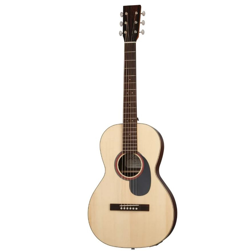Это электроакустическая гитара с компактным корпусом Parlor, сочетающая в себе аккуратный внешний вид и выразительное, сбалансированное звучание. Верхняя дека гитары выполнена из массива ситхинской ели, известного своим звонким, ярким тембром и чуткой реакцией на нюансы исполнения. Нижняя дека и обечайка изготовлены из палисандра, который усиливает нижнюю середину и басы, добавляя глубины и насыщенности общему тону.