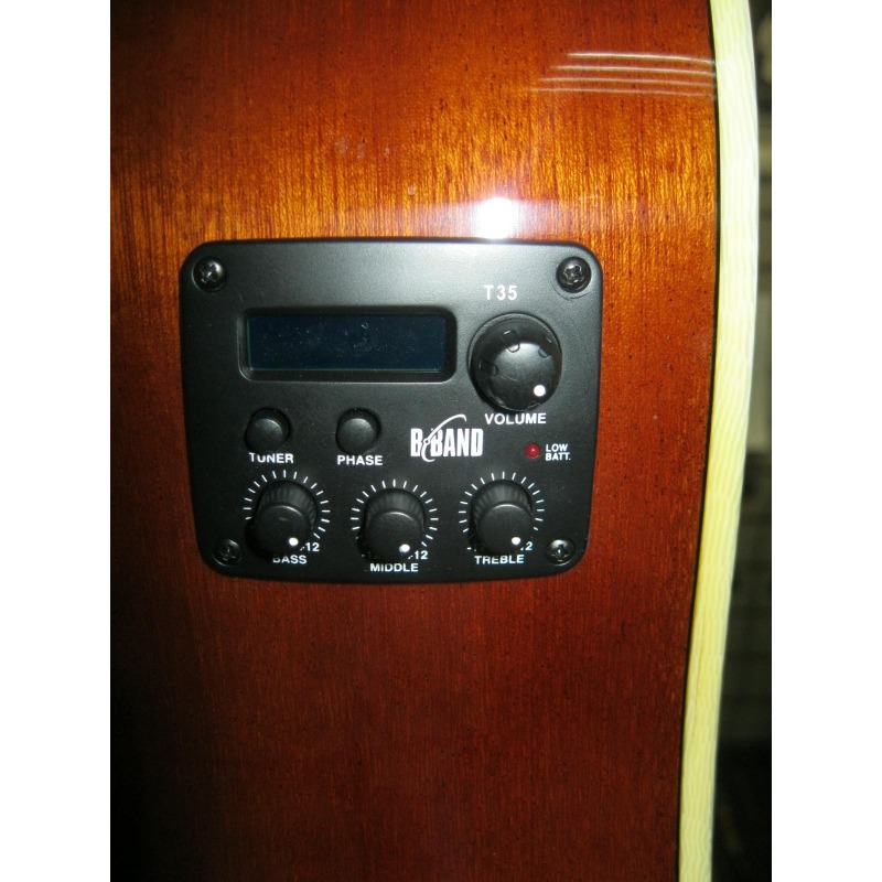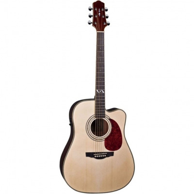Материал верхней деки цельная ель, материал нижней деки древесина красного дерева, материал грифа древесина красного дерева, материал накладки грифа древесина палисандрового дерева, форма грифа традиционная, колки открытые, хромированные, отделка корпуса прозрачная отделка древесины, мензура 650 мм, количество ладов 20, количество струн 6, электроника пьезо-звукосниматель, преамп пассивный с громкостью и тембром, покрытие нитроцеллюлозный лак.