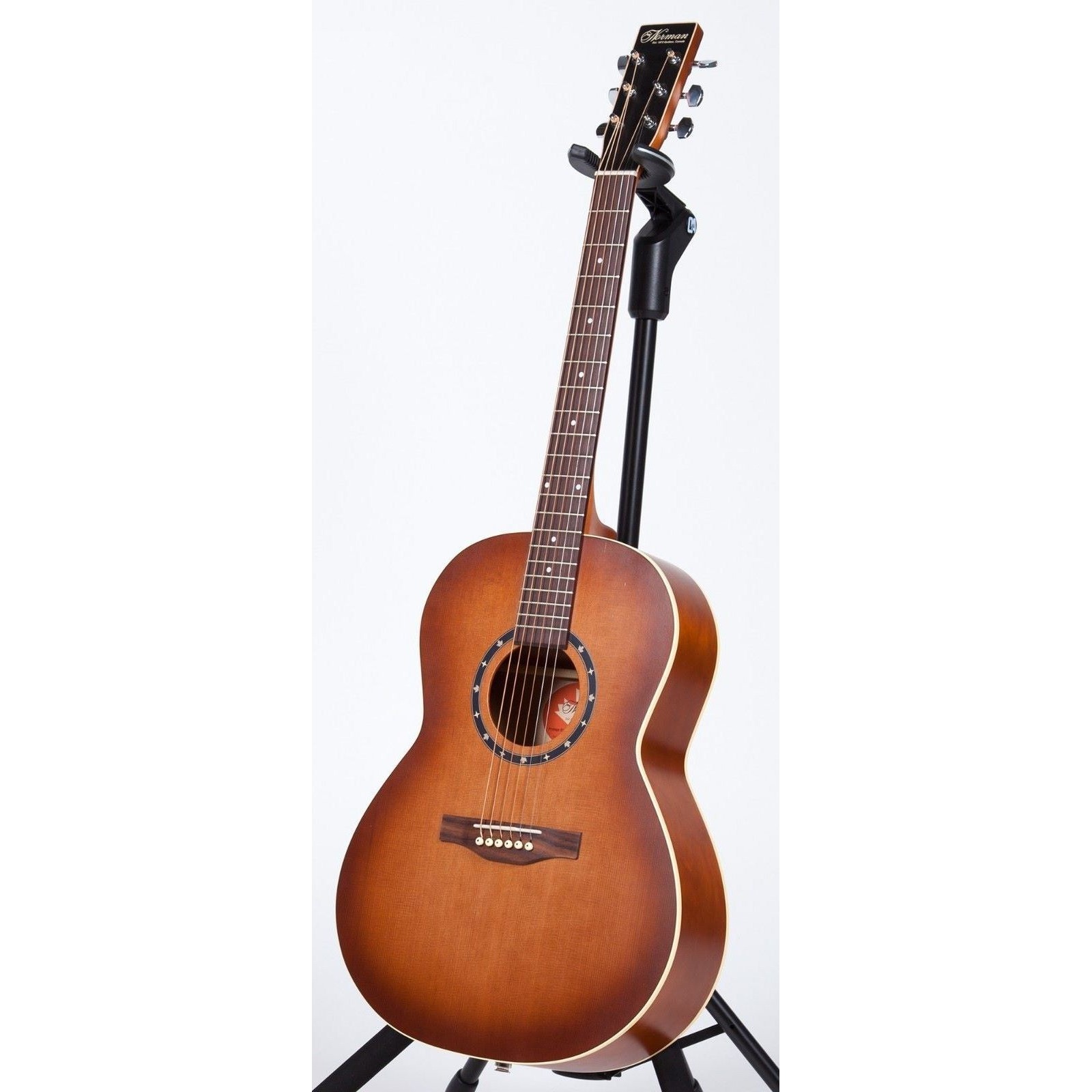 Верхняя дека изготовлена из массива кедра, задняя дека и обечайка дикая вишня, гриф клен серебристый. Звукосниматель Fishman Presys с 3-полосным эквалайзером и тюнером. Форма корпуса фолк. Цвет санберст Tobacco Burst.