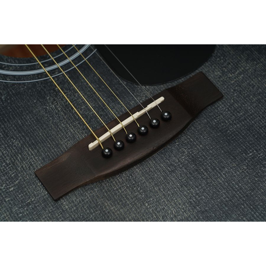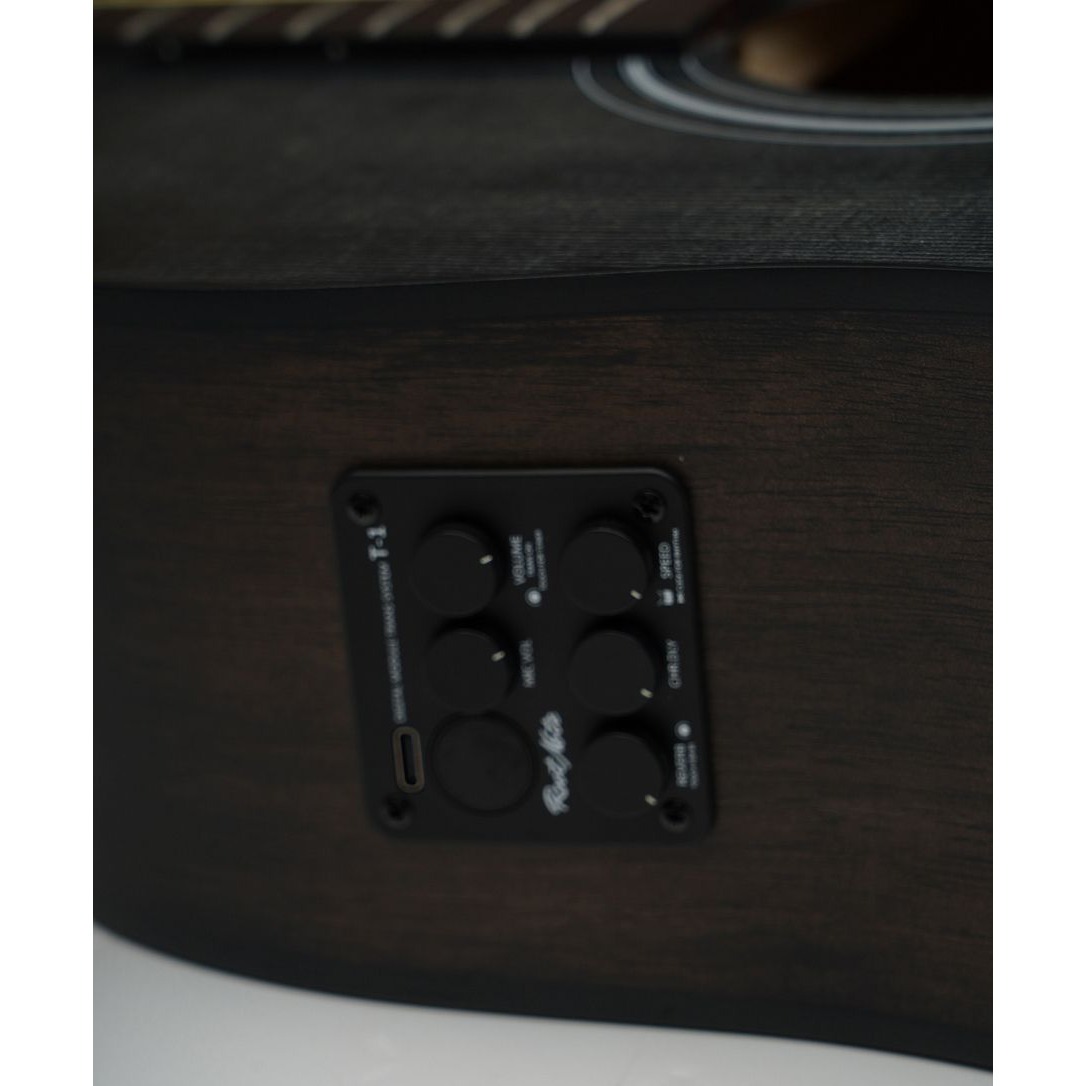 Трансакустическая гитара чёрного цвета. Модель сочетает классический дизайн и современные технологии, что позволяет использовать её как в акустическом, так и в усиленном режиме.