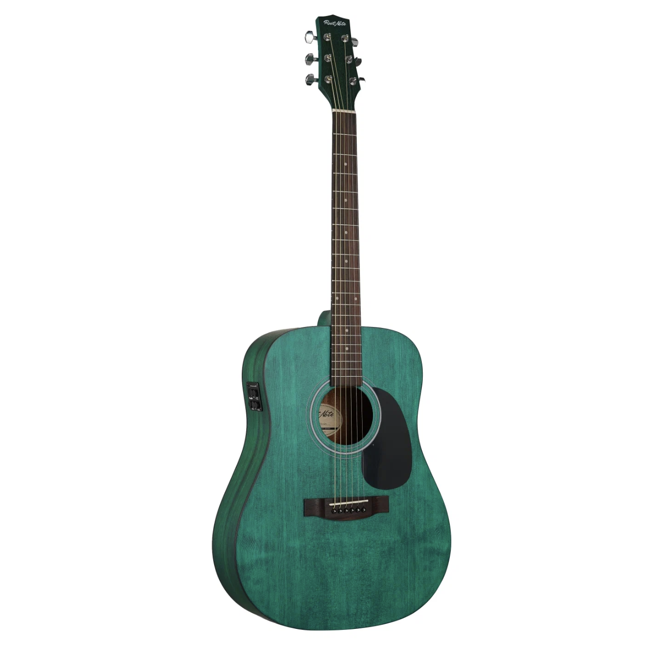 Трансакустическая гитара зелёного цвета. Модель сочетает классический дизайн и современные технологии, что позволяет использовать её как в акустическом, так и в усиленном режиме
