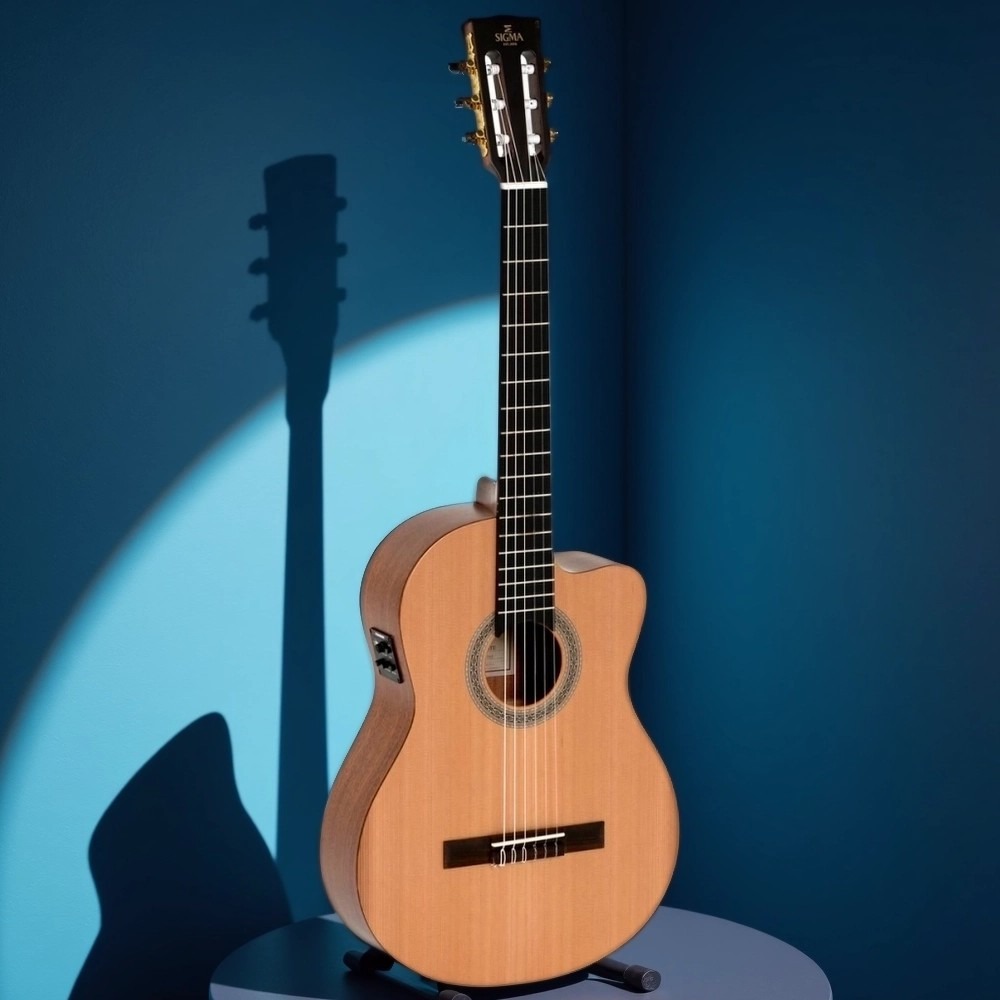 Sigma CMC-STE классическая электроакустическая гитара – это серьёзный инструмент для активной музыкальной деятельности. Качество материалов и сборки находится на очень высоком уровне и полностью оправдывает приличную стоимость этой гитары. Верхняя дека изготовлена из массива кедра, нижняя дека и обечайки – махагон, гриф – махагон с накладкой из индийского палисандра. Корпус инструмента имеет вырез для более удобной игры на верхних ладах. Система подзвучки состоит из активного предусилителя Fishman Isys+ с тюнером и двухполосным эквалайзером.
