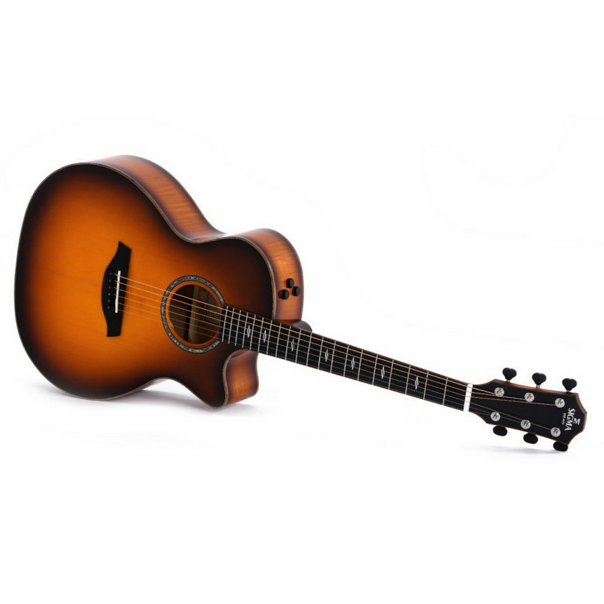 Новинка 2018 года Sigma GACE-3-SB+ создана, чтобы обеспечить выступающих гитаристов и авторов песен универсальным, четким и мощным звуком, а также невероятно привлекательным внешним видом. Grand OM-14 Fret с вырезом корпус напоминает размер и пропорции гитар grand auditorium и, таким образом, делает ее универсальным инструментом, подходящим ко всем музыкальным жанрам и игровым стилям. Топ из массива альпийской ели позволяет гитаре производить более звонкие тона по сравнению с другими разновидностями ели, в итоге звук подобно колокольчикам, пышущим изобилием обертонов. Она присоединена к визуально привлекательным нижней деке и обечайкам из волнистого клена, который способен проецировать громкий яркий звук, при этом идеально сбалансированным. Более того, он воспроизводит ноты четко, чисто и с великолепным сустейном. В итоге, общее звучание резонансное, яркое и насыщенное. И, поскольку, это электроакустическая гитара, она оборудована системой Fishman Flex Plus, дизайн которой отличается стильными регуляторами громкости, НЧ и ВЧ для возможности формирования звучания при подключении по собственным предпочтениям в соответствии с живым, студийным или исполнении во время репетиции.
