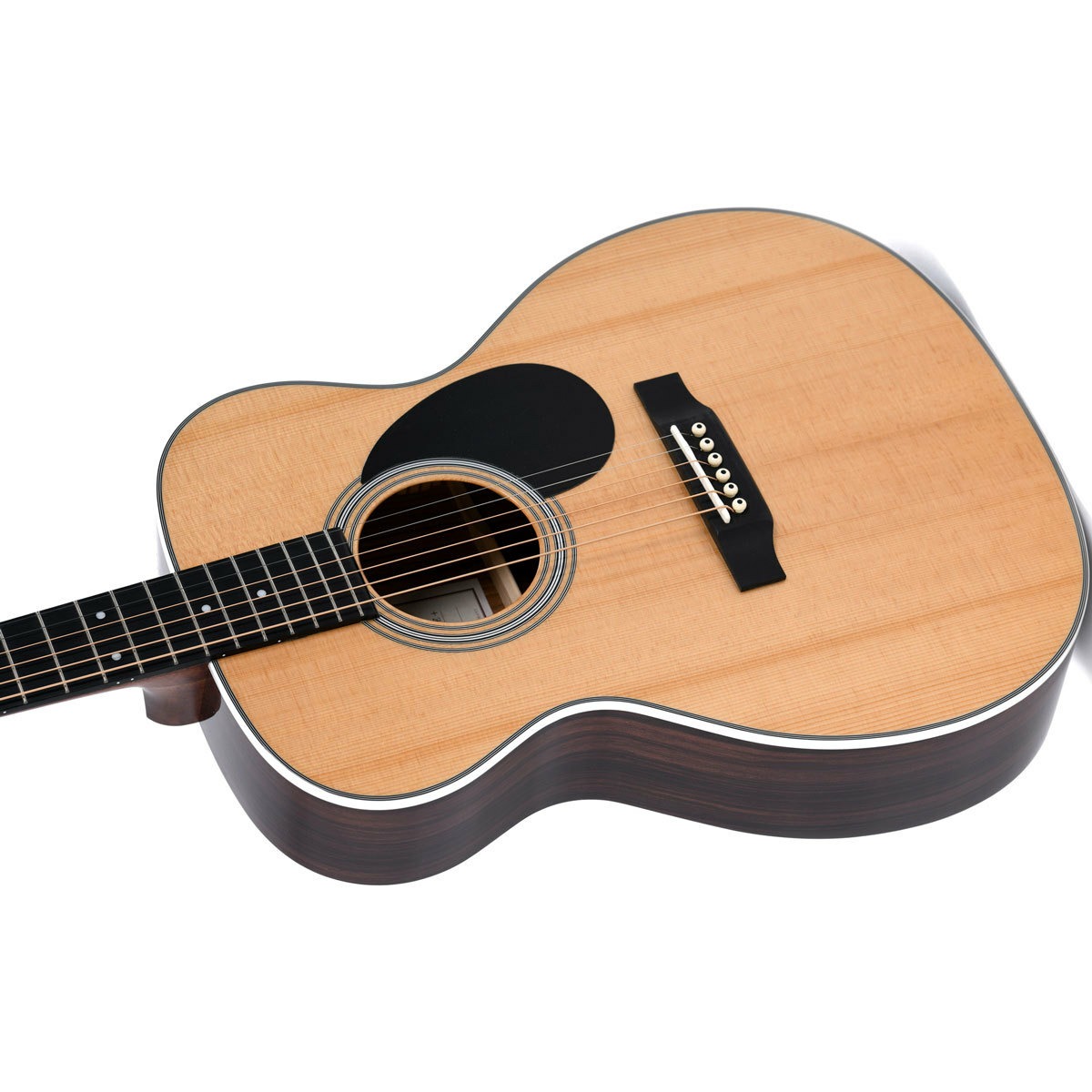 С топом из цельной сихтинской ели в паре с липовым корпусом она воспроизводит яркий отчетливый тон и предоставляет широкий динамический диапазон, что в целом дает разностороннее звучание, идеально подходящее к многочисленным жанрам и техникам исполнения. Порожки из натуральной кости наполняют его дополнительным резонансом и сустейном, а 000-14 Fret размер корпуса невероятно комфортный как для игры стилем fingerpicking, так и более агрессивным боем, таким образом, она создает универсальную платформу для гитаристов, желающих поэкспериментировать со стилем. А традиционный акустический образ, который включает черный пикгард, белую окантовку и хромированную фурнитуру, предлагает стильный вид, привлекающий внимание, как и потрясающее звучание.
