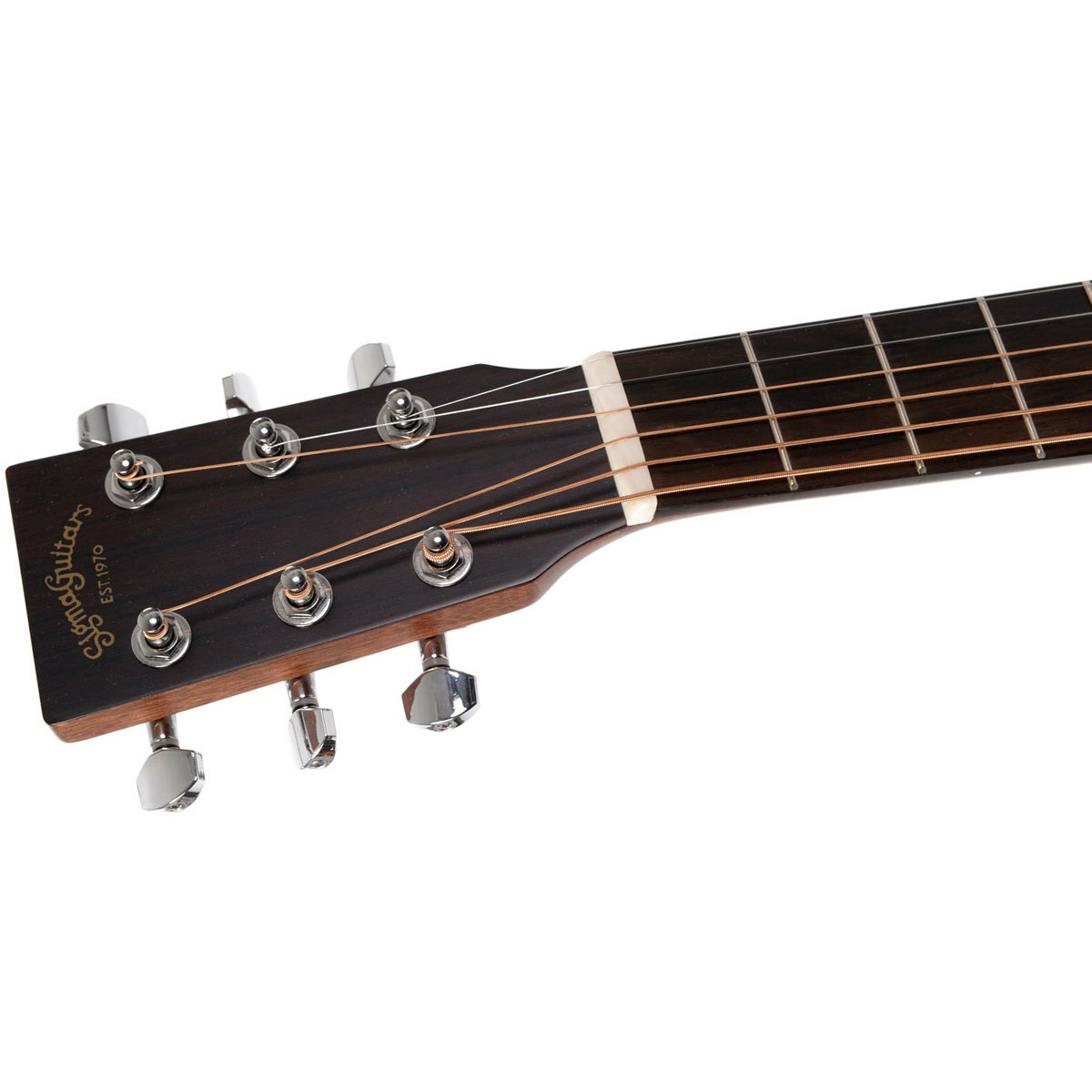 Массив сихтинской ели тщательно и качество присоединен к массиву махагони, что в итоге предоставляет совокупность потрясающего звучания, богатого и резонансного, которое безупречно впишется в любой жанр музыки и стиль/технику исполнения. Изготовленный из махагони гриф имеет низкий профиль для максимального удобства и наилучшего захвата в каждой позиции, а также оборудован накладкой из микарты, которая характеризуется гладкой и высокоплотной текстурой. Порожки из натуральной кости помогают увеличить сустейн и долгое время стабильно держат настройку. А поскольку этот инструмент оборудован Fishman Isys T электроникой, она становится идиллической тревел гитарой с классическим акустическим звуком, который легко может быть усилен для импровизированного концерта во время путешествия. Данная система включает кнопку фазы, предотвращающую нежелательную обратную связь, темброблок для настройки желаемого тона и тюнер с ярким и легко читаемым светодиодным дисплеем.
