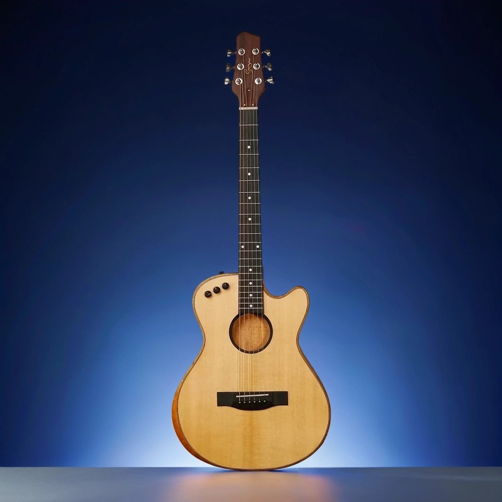 | Корпус | Тонкий, размером 40 дюймов. Верхняя дека из массива ели обеспечивает яркий и чистый звук с насыщенным резонансом, богатыми низкими частотами, тёплыми средними и яркими высокими. Задняя дека и обечайки из окоуме добавляют естественной теплоты звучанию, гармонируя с еловой верхней декой |