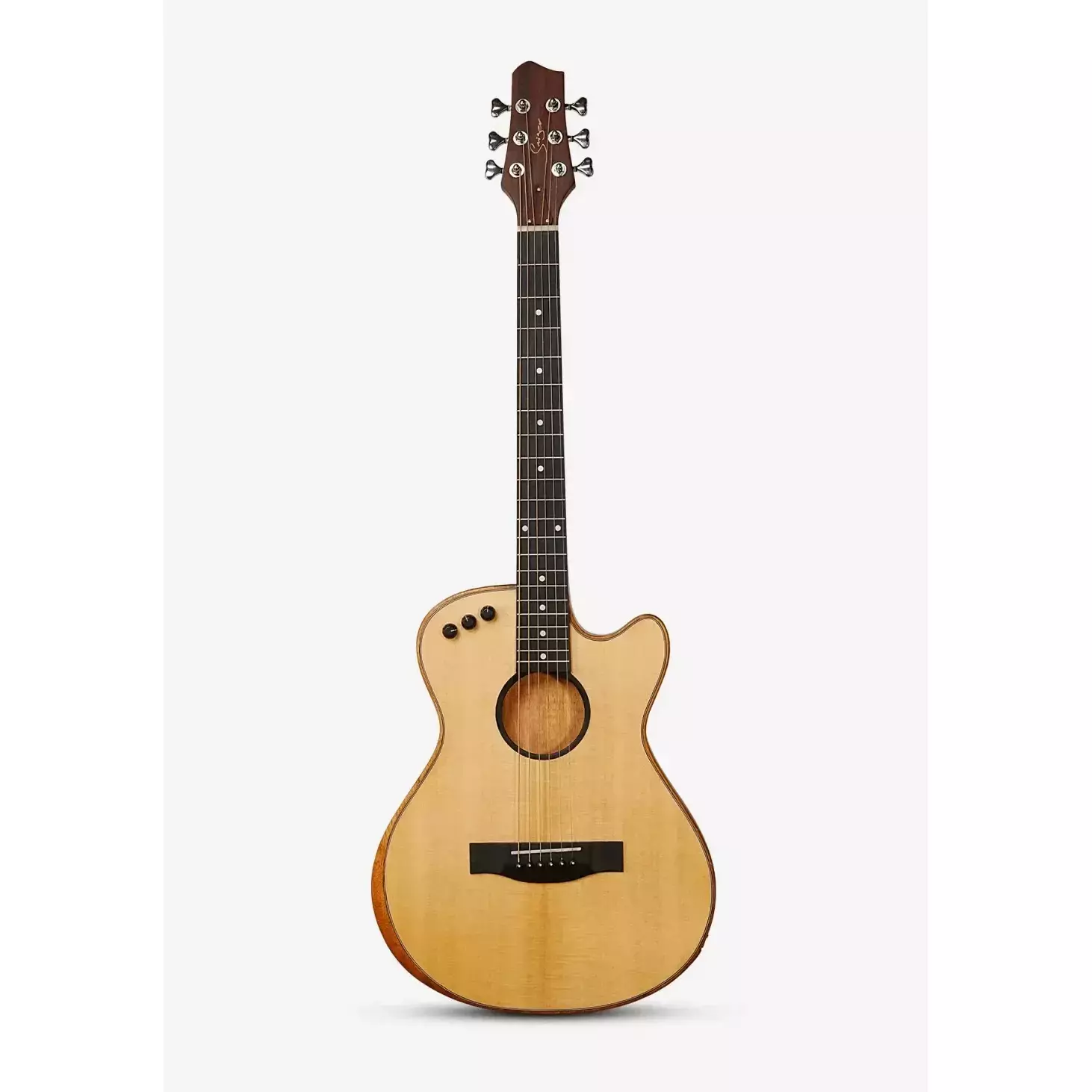 Это 6-струнная электроакустическая гитара в натуральном цвете. Инструмент сочетает акустические свойства с возможностью подключения к усилителю или записывающему оборудованию благодаря встроенному звукоснимателю. Подходит для фолк-музыки, поп-стиля и других жанров, где важна сбалансированность звучания.