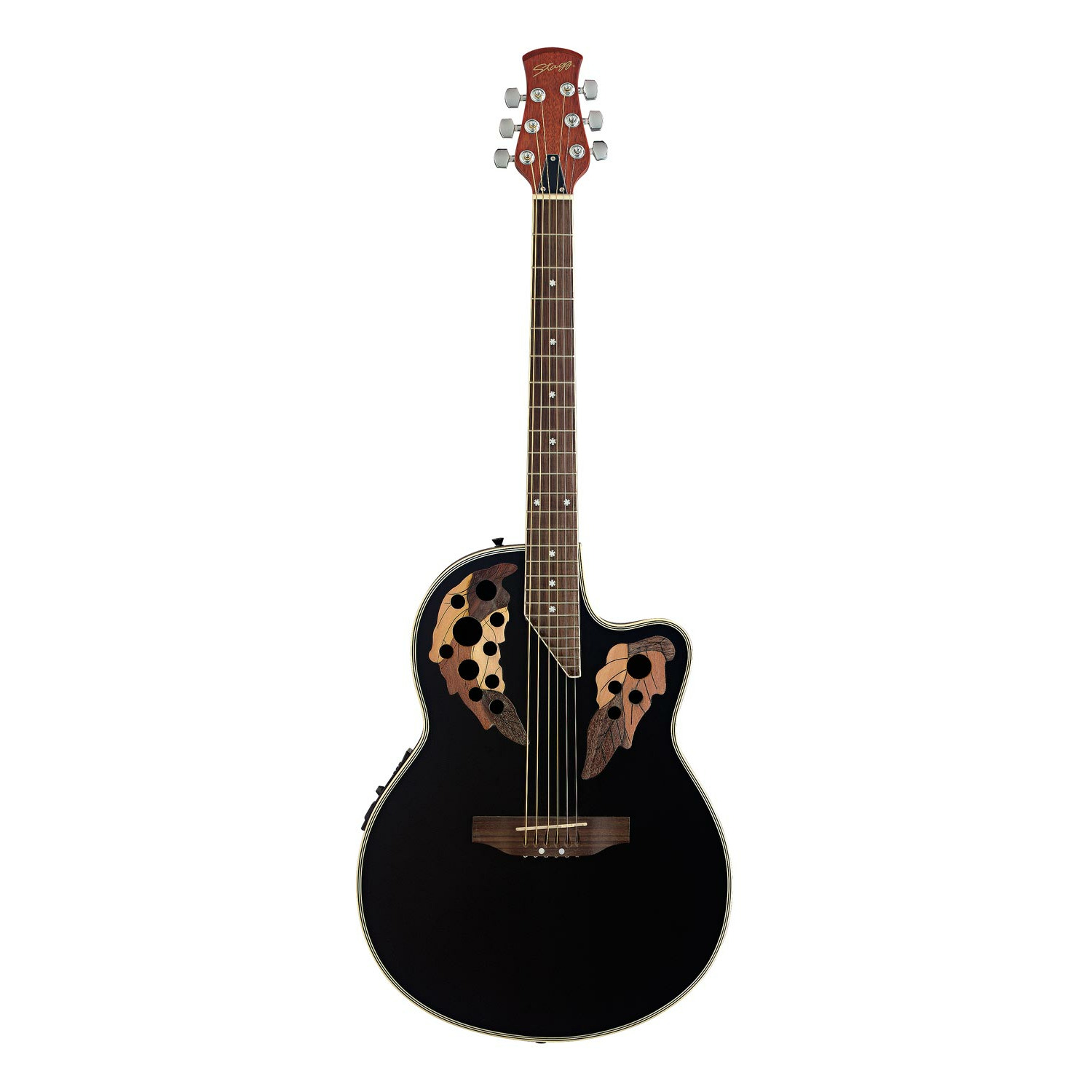 Электроакустическая гитара STAGG A2006 моментально выделяется на фоне других инструментов за счёт тонкого корпуса со скруглённой задней декой из чёрного графита и пёстрой верхней декой со множеством небольших отверстий разного диаметра. Пьезодатчик с активным темброблоком обеспечивает гитаре качественную подзвучку и богатое, сочное звучание через усилитель. Темброблок оснащён трёхполосным эквалайзером и для корректной работы требует батарейку типа «крона». Вырез на деке для левой руки облегчает доступ к верхним ладам. Одним словом, получился красивый и качественный инструмент, способный заинтересовать как любителей, так и профессионалов.
