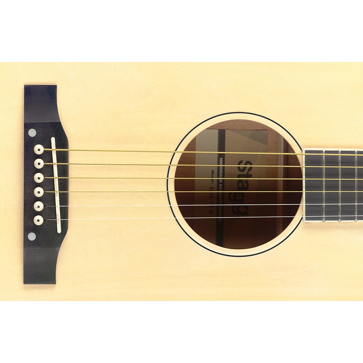 Бридж STAGG SA35 DSCE-N сделан из синтетической древесины, нижний порожек – с обычным углом. Кант верхней и нижней деки, а также грифа – белого цвета, что в сочетании с чёрным глянцевым корпусом придаёт гитаре современный вид. Колковый механизм – литой никелевый. Наконец, изюминка гитары – ее электроника с передатчиком B-Band, хроматическим тюнером, регулятором громкости и эффекта присутствия, трехполосным эквалайзером и индикатором низкого заряда батареи. На корпусе есть выходной разъем на классическом 6.35 мм Jack.