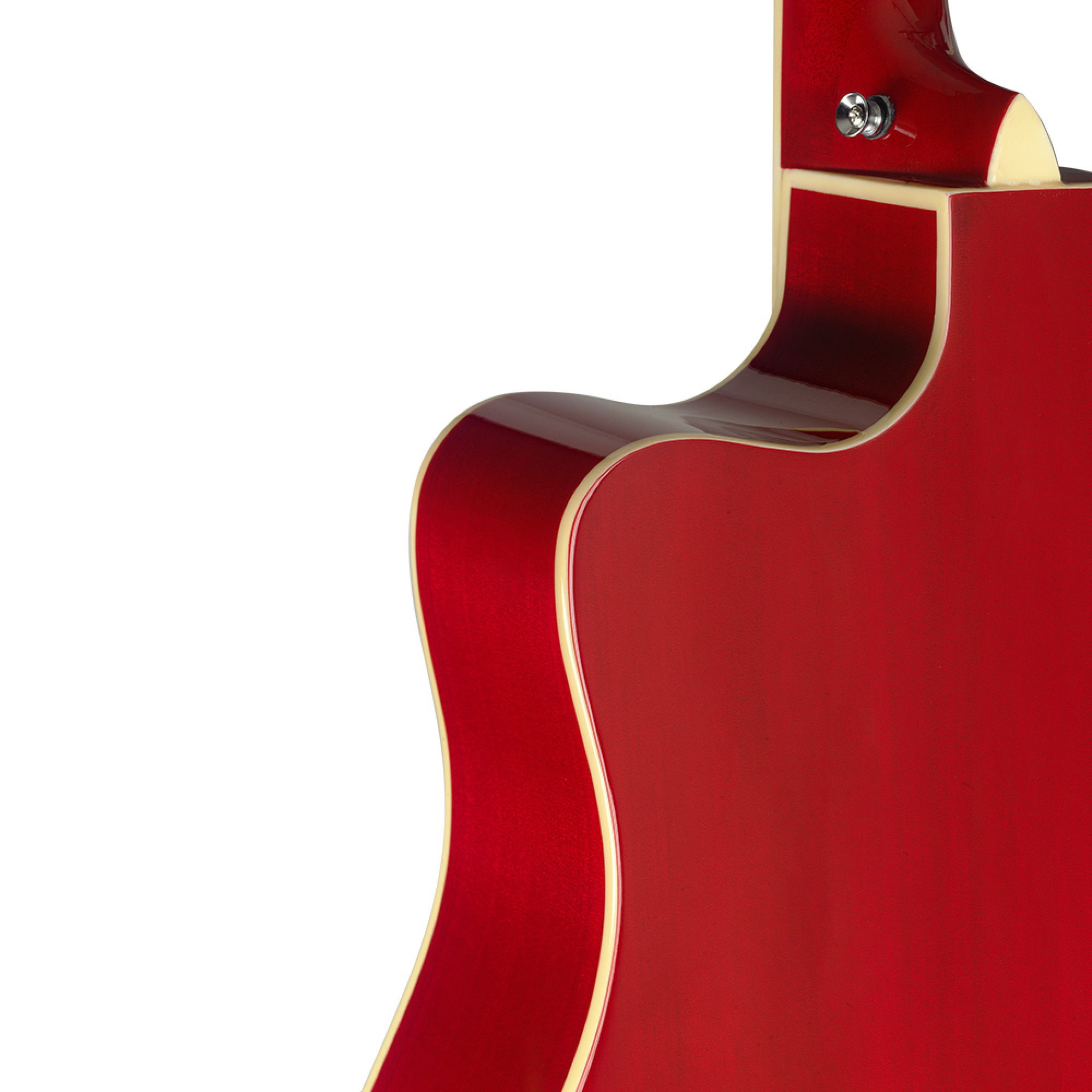 STAGG SA35 DSCE-TR – шестиструнная электроакустическая гитара в корпусе типа «дредноут» с одиночным катавеем для легкого доступа к верхним ладам. Верхняя дека изготовлена из классической липы, нижняя дека и обечайки – из экзотического дерева катальпа. Из катальпы же сделан и гриф с накладкой из синтетической древесины. Цвет гитары – глянцевый прозрачно-красный.