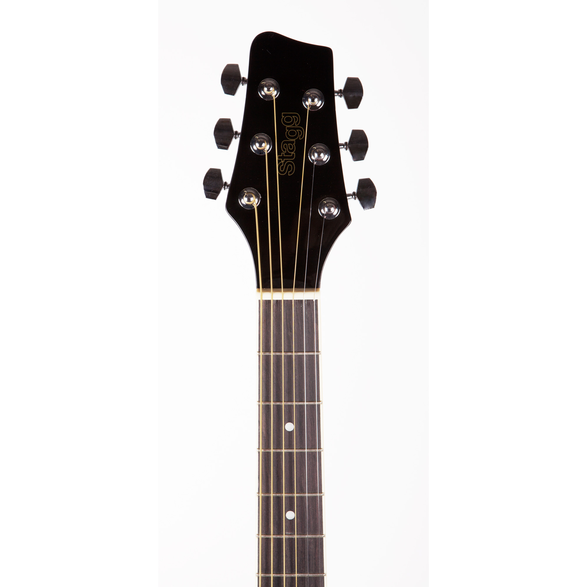 STAGG SW201CW/39 BK – шестиструнная электроакустическая гитара в корпусе типа dreadnought черного цвета с глянцевой отделкой. Гитара относится к бюджетному сегменту, но это не мешает ей быть хорошим высококачественным инструментом. Корпус гитары целиком выполнен из липы (верхняя дека, нижняя дека, обечайки). Гриф создан из древесины нато, накладка на гриф и собственно бридж – из окрашенного клёна чёрного цвета. Колки – никелированные и «укрытые».