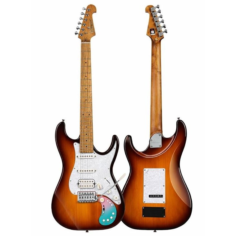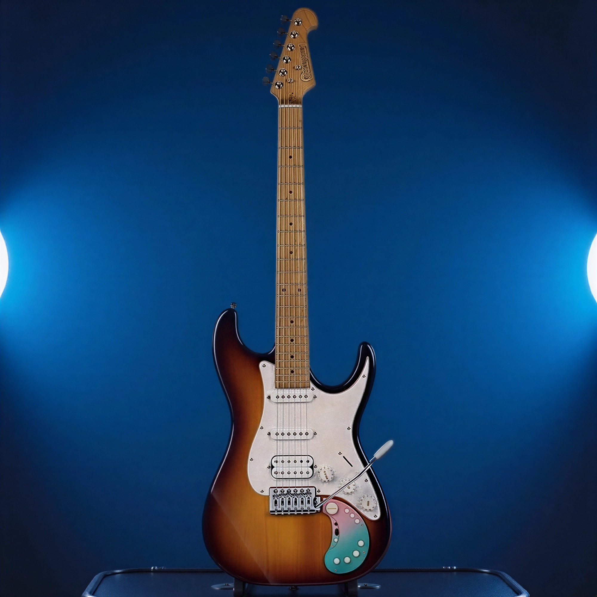 Корпус из тополя в сочетании с грифом и накладкой из печеного клена обеспечивает сбалансированное звучание с четкими верхами и насыщенными средними частотами. Конфигурация звукоснимателей HSS (два сингла и хамбакер) предоставляет широкий диапазон тембров.