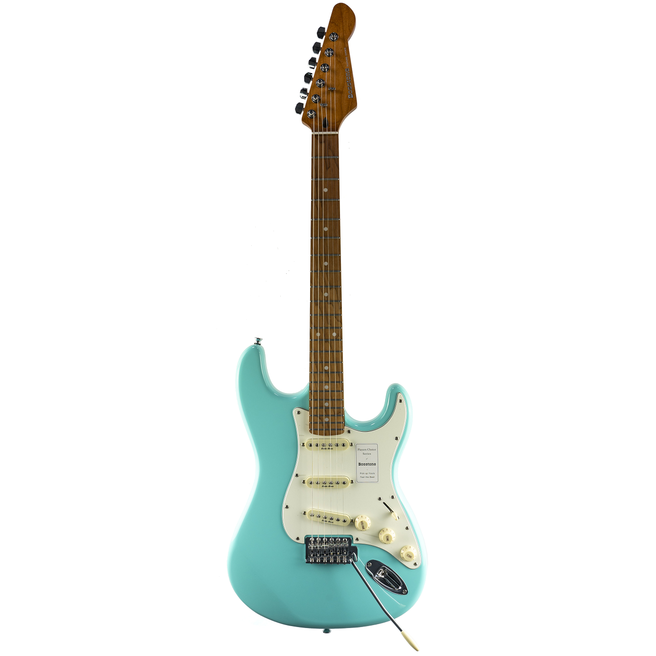 Гитара Bosstone SEG-03 объединяет классическую форму с великолепным дизайном. Корпус, выполненный из тополя. По своим свойствам это дерево похоже на ольху, но существует мнение, что тополь лучше справляется с верхней серединой. Уникальной чертой этих гитар является гриф из обожженного клена, который придаёт инструменту современный вид и обеспечивает его стабильность. Это проверенное сочетание материалов гарантирует выдающуюся тональную универсальность. Гриф крепится к корпусу с помощью болтов и оснащён 22 ладами. Мензура составляет 648 мм. Колки литые, а бридж представлен в виде Vintage Tremolo на 6 винтах