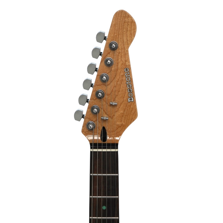 Bosstone SEG-04 BK — современная электрическая гитара для правшей, сочетающая в себе классический дизайн и профессиональное звучание. Корпус из тополя в сочетании с грифом из карамелизованного клёна обеспечивает богатый, насыщенный тон. Удобная мензура 25,5" (648 мм) и эргономичный «С»-образный профиль грифа с комфортной толщиной 22 мм на первом ладу и 23 мм на двенадцатом делают игру максимально комфортной. 22 скруглённых лада и радиус накладки 14" (355 мм) позволяют легко исполнять как ритм-, так и соло-партии. Комбинация звукоснимателей — два сингла и хамбакер Alnico Little Giant SSF-1 — в сочетании с пятипозиционным переключателем, регулятором громкости и двумя ручками тембра открывает широкие возможности для создания различных звуковых оттенков. Система тремоло и надёжный двойной анкер с 4 мм болтом гарантируют стабильность настройки. Хромированная фурнитура и стильный чёрный цвет корпуса делают эту гитару не только отличным инструментом для игры, но и эффектным элементом сценического образа.