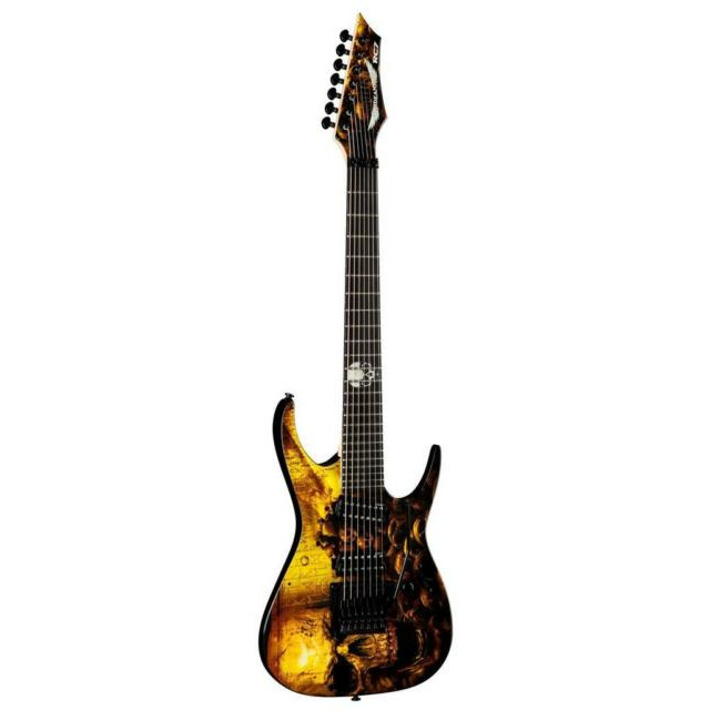 Dean RC7X MBK Rusty Cooley - 7 струнная электрогитара из именной серии Rusty Cooley Signature Series (Rusty Cooley)- один из самых техничных и быстрых гитаристов в США). Корпус и топ этого инструмента изготовлены из ольхи. Гриф - кленовый с накладкой из черного дерева, крепится к корпусу на болтах. На гитаре установлены звукосниматели EMG707, также следует отметить Floyd Rose. Цвет инструмента - Графика "Черепа".