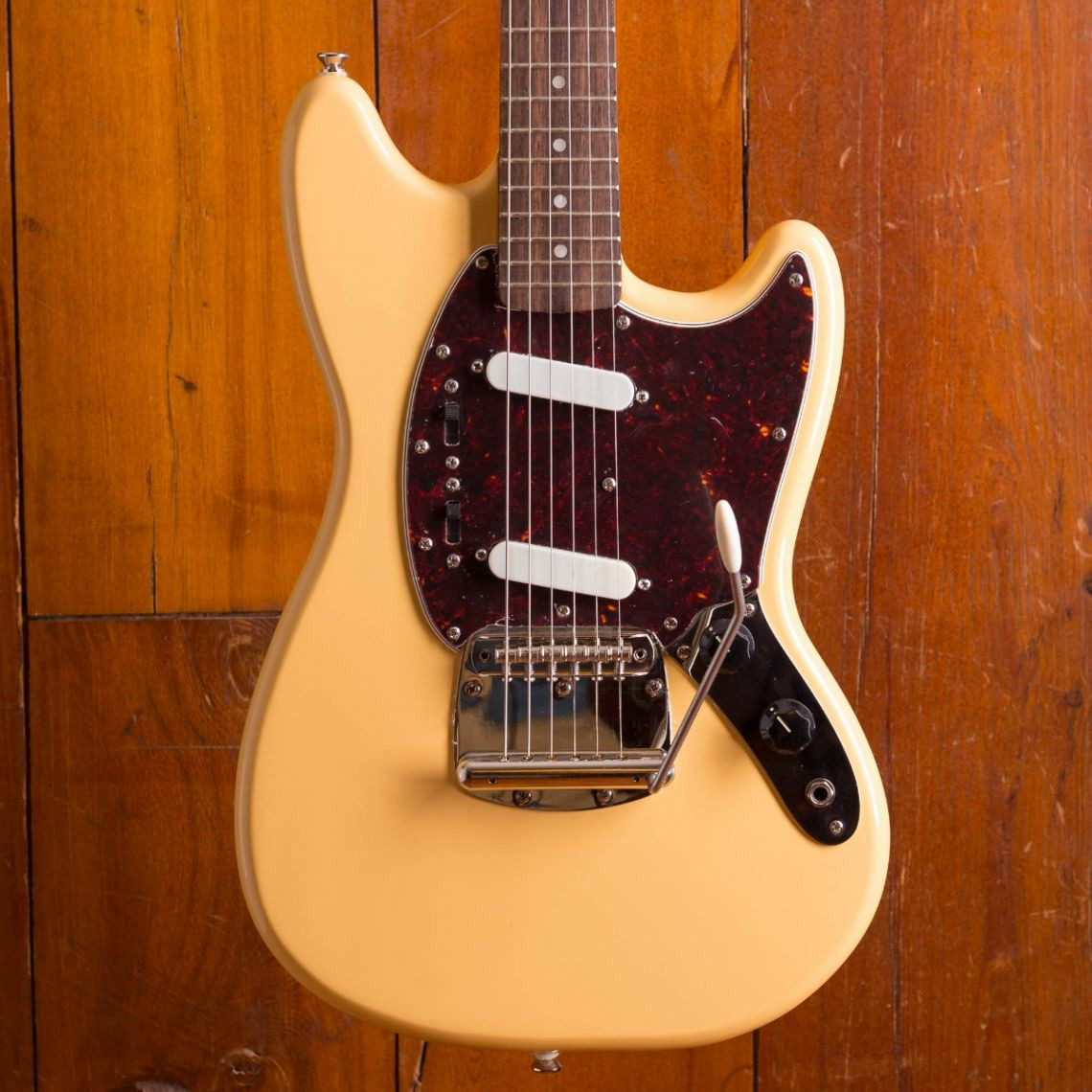 Эта компактная гитара в обтекаемом корпусе Mustang® узнаваемой асимметричной формы обладает мощным звучанием, достигаемым благодаря двум синглам с магнитами Alnico собственной разработки Fender. Ретро-дизайн модели дополняют надписи на голове грифа в стиле шестидесятых, дорого выглядящая никелированная фурнитура, тонированное глянцевое уретановое покрытие грифа, колки в винтажном стиле. Корпус гитары выполнен из тополя. Тонкий кленовый гриф профиля «С» оснащен удобной накладкой радиуса 9,5 дюймов из терминалии. Музыканты с небольшим размером руки оценят по достоинству удобство укороченной 24-дюймовой мензуры. На грифе 22 лада Narrow Tall с инкрустацией белыми точками. Регуляторы: громкость и тембр. Бридж - плавающее тремоло Vintage-Style. Представленная модель – элегантного желтоватого цвета «Vintage White» с глянцевым полиуретановым покрытием, четырехслойным черепаховым пикгардом.