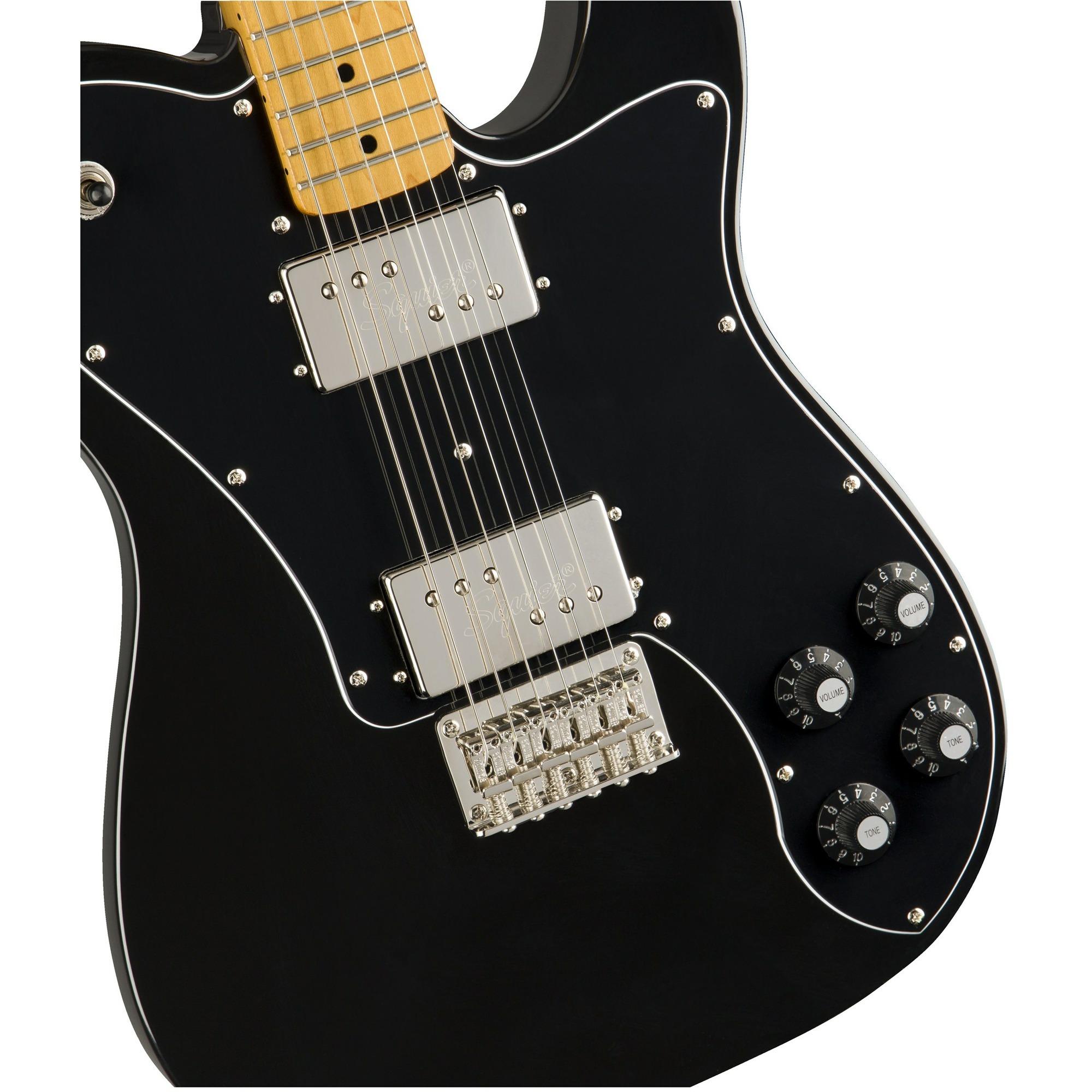 Эта гитара обладает безошибочно узнаваемым звучанием, достигаемым благодаря конфигурации звукоснимателей: двум мощным хамбакерам Wide Range собственной разработки Fender. Настройка осуществляется трехпозиционным переключателем звукоснимателей, двумя регуляторами тембра и двумя регуляторами громкости. Винтажный облик инструмента включает надписи на голове грифа в стиле семидесятых, дорого выглядящую никелированную фурнитуру, тонированное глянцевое уретановое покрытие грифа, колки в винтажном стиле. Корпус гитары классической формы Телекастер выполнен из тополя. Тонкий кленовый гриф профиля «С» оснащен удобной накладкой радиуса 9,5 дюймов, также из клёна. На грифе 21 лад Narrow Tall с инкрустацией черными точками. Фиксированный бридж Vintage-Style Tele® (струны сквозь корпус) обеспечивает стабильность строя. Представленная модель – черного цвета с глянцевым полиуретановым покрытием, трехслойным черным пикгардом.
