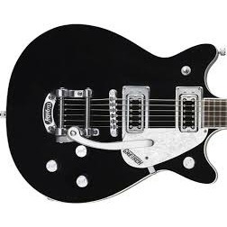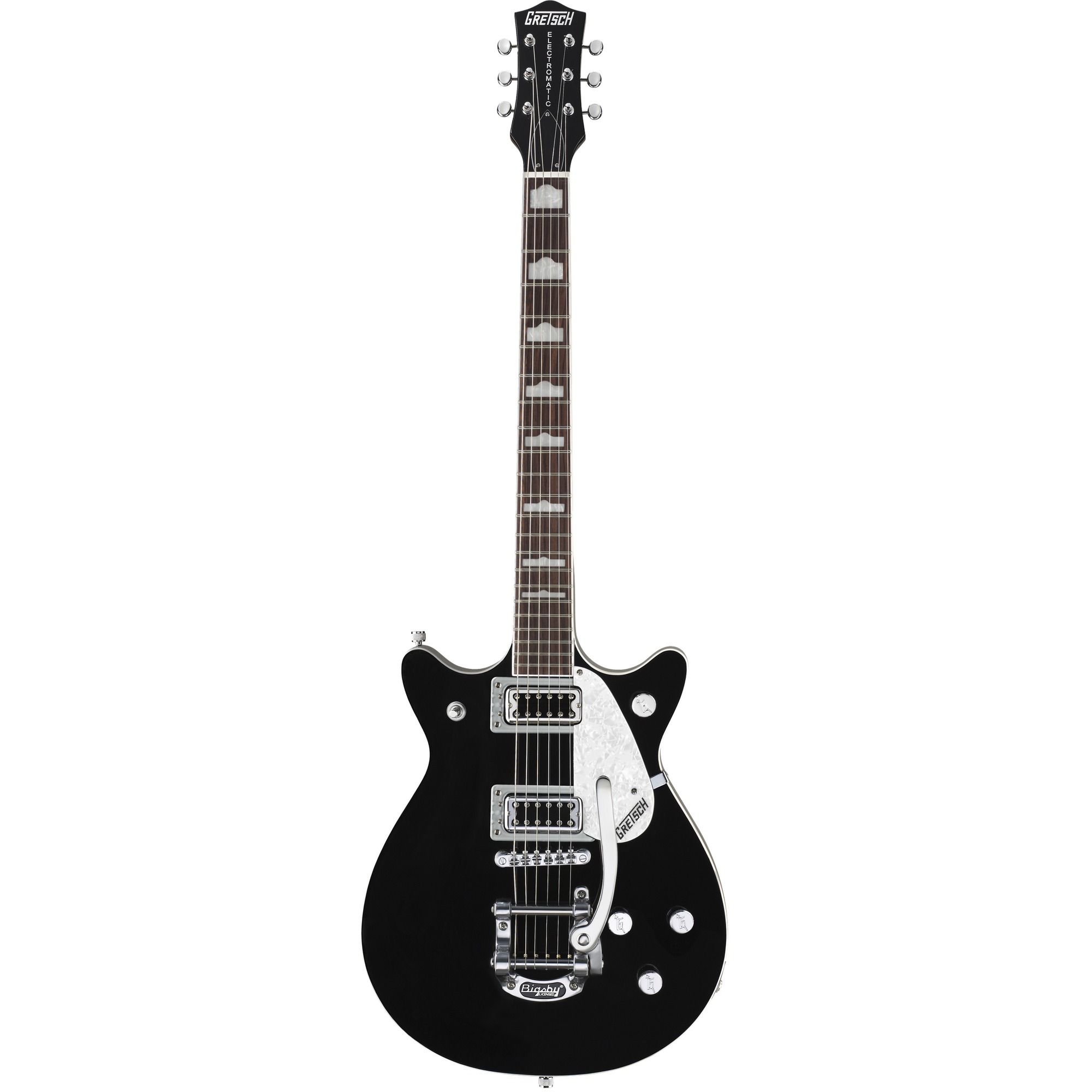 Gretsch G5445T Double Jet™ - шестиструнная электрогитара из линейки Electromatic® Pro Jet. Эта модель сочетает в себе классические технологии и узнаваемое звучание Gretch, элегантный внешний вид и отличную современную электронику. При этом цена её весьма демократична. Гитара заключена в корпус формы Jet™ с двумя вырезами, выполненный из древесины липы с выгнутым топом из ламинированного клёна. Гриф – кленовый, с глянцевой отделкой. Мензура – 625 мм (24.6 дюйма). Накладка – палисандровая, радиус – 12 дюймов (305 мм). На грифе 22 лада Medium Jumbo с оригинальной инкрустацией перламутровыми прямоугольниками с выступом. Порожек выполнен из искусственной кости. Звукосниматели – два хамбакера собственной разработки Blacktop™ Filter'Tron™. Переключатель – 3-позиционный. В дополнение к регуляторам тембра и общего уровня громкости предусмотрены отдельные регуляторы громкости для каждого из звукоснимателей. Бридж Adjusto-matic™ обеспечивает надежность строя, а тремоло Bigsby® B50 даёт широкие возможности для экспрессивной игры. Инструмент элегантно выглядит в черном цвете с регуляторами формы G-Arrow и эффектным контрастным перламутровым пикгардом с черным логотипом Gretch. На инструменте установлены струны D'Addario® XL110 Regular Light, NPS толщиной .010 - .046.