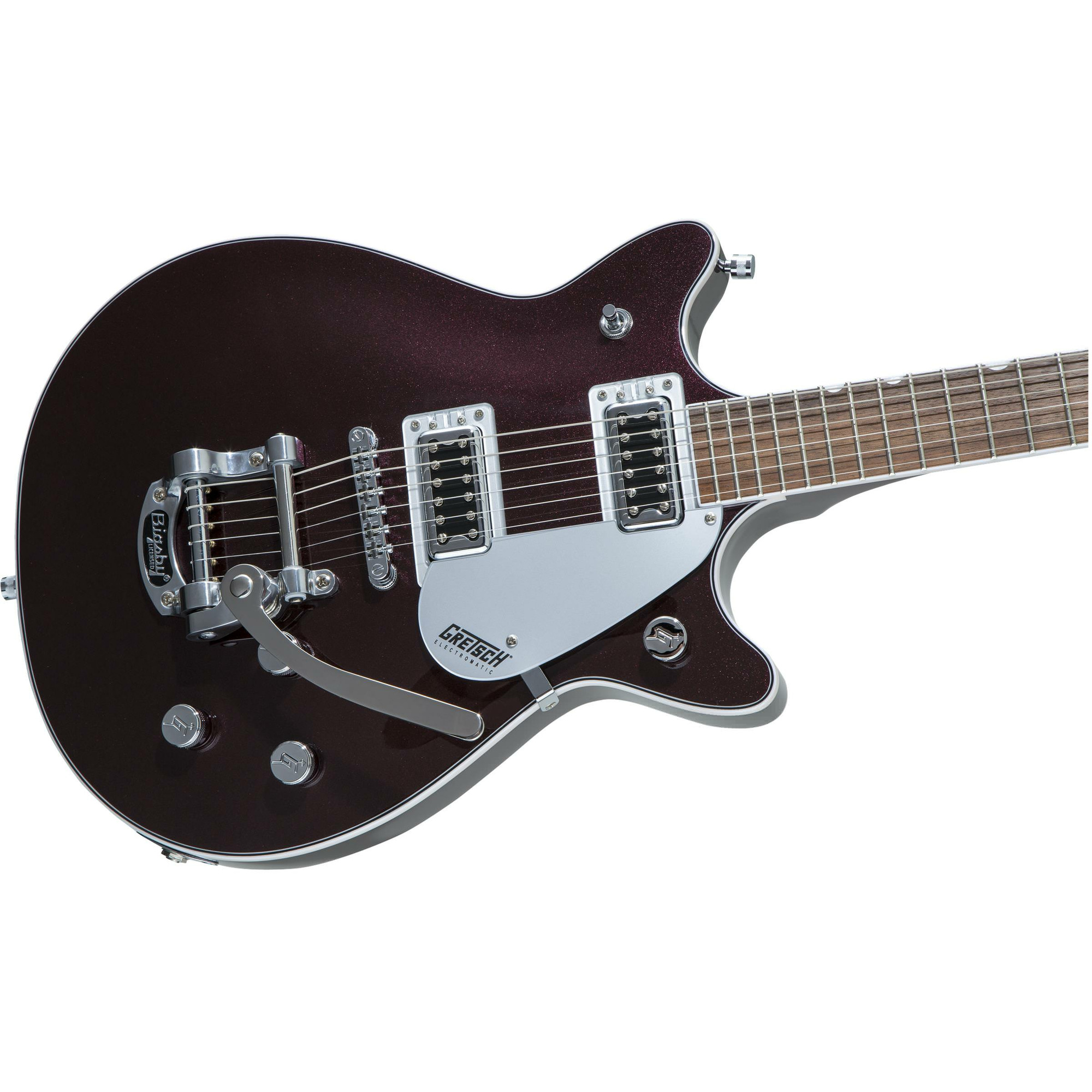 GRETSCH GUITARS G5232T EMTC DBL JET FT DCM - это шестиструнная электрогитара. Инструмент под правую руку гитариста. Этот инструмент имеет оригинальное, узнаваемое звучание гитар Gretsch, которое нельзя спутать с другими марками гитар. Также гитара отличительна оригинальным стилем деки и головы грифа. Инструмент оборудован грифом из красного дерева с накладкой из ореха. Мензура электрогитары составляет 625 мм, цвет гитары - вишнёвый металлик. Ширина верхнего порожка 42,9 мм.