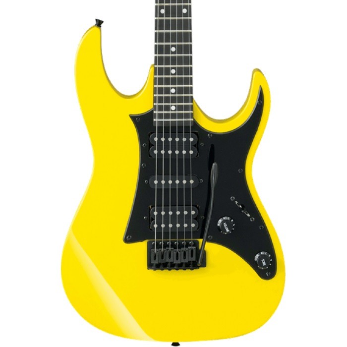 IBANEZ GRX55B-YE – шестиструнная электрогитара из самой узнаваемой линейки Ibanez – RG. Это инструмент с мощным звуком, идеальный для скоростной игры. Характерные черты гитары сформировались за три десятилетия развития металла. Корпус инструмента выполнен из тополя. Гриф GRX – из клена. Накладка на гриф – из специальным образом обработанной новозеландской сосны. Радиус накладки – 305 миллиметров. Мензура – 25,5 дюйма (648 миллиметров), лады Medium инкрустированы белыми точками. Звук формируется тремя пассивными звукоснимателями Infinity с керамическими магнитами. Это два хамбакера, у бриджа и у грифа, плюс сингл в средней позиции. Переключатель – пятипозиционный. Настройка осуществляется регуляторами громкости и тембра. Бридж – тремоло собственного производства Ibanez T106, он обеспечивает удобство при игре и стабильность строя. Модель выпускается в трех вариантах цветового исполнения. Представленная гитара – эффектного яркого желтого цвета с черной головой грифа и черной фурнитурой.