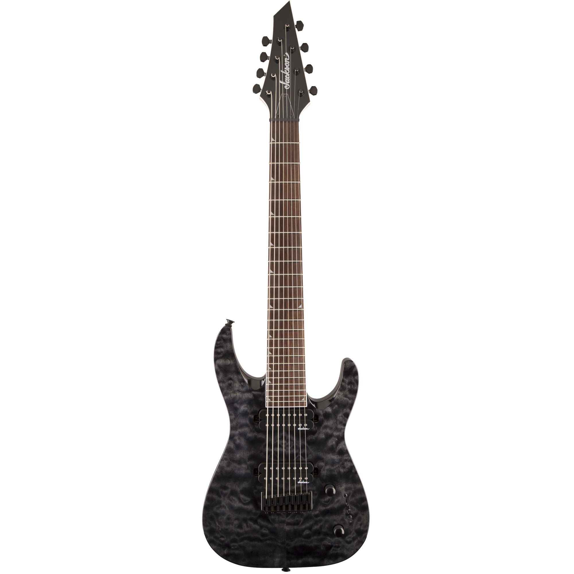 Бридж данной модели – фиксированный Jackson® HT8 8-String струны сквозь корпус, гарантирующий надежность строя инструмента. Звукосниматели - два мощных хамбакера (HH), специально разработанных для восьмиструнных гитар Jackson® High Output 8 String, открытого типа, черного цвета. Переключение между ними осуществляется при помощи трехпозиционного переключателя звукоснимателей (Bridge - Bridge+Neck - Neck). Элементы управления включают ручки настройки громкости и тона.