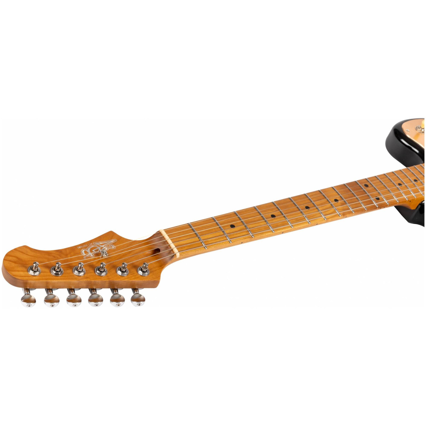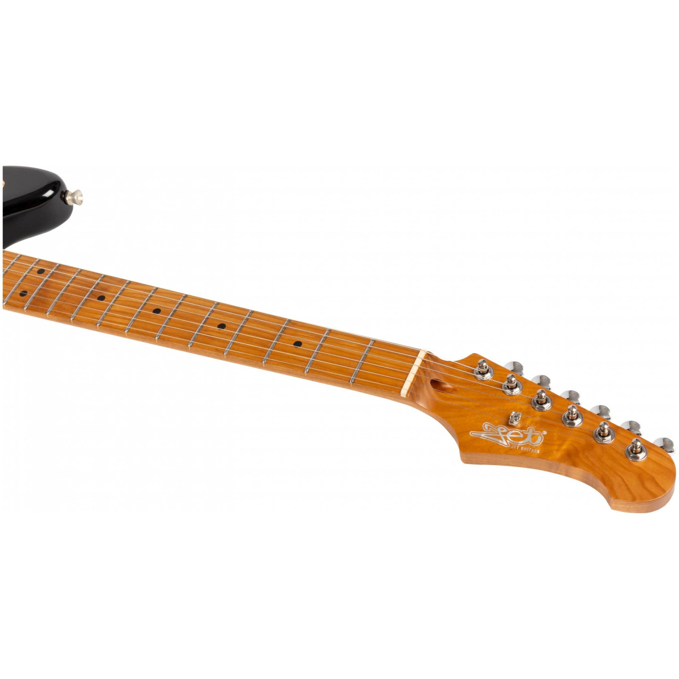Гриф и накладка на гриф выполнены из печеного клена (roasted maple). При такой обработке поры дерева максимально сжимаются и в процессе использования вода уже не будет выходить, ваша накладка не сожмется и лады не повылазят вне зависимости от влажности и смены температуры. Плюс такое дерево выглядит очень красиво.