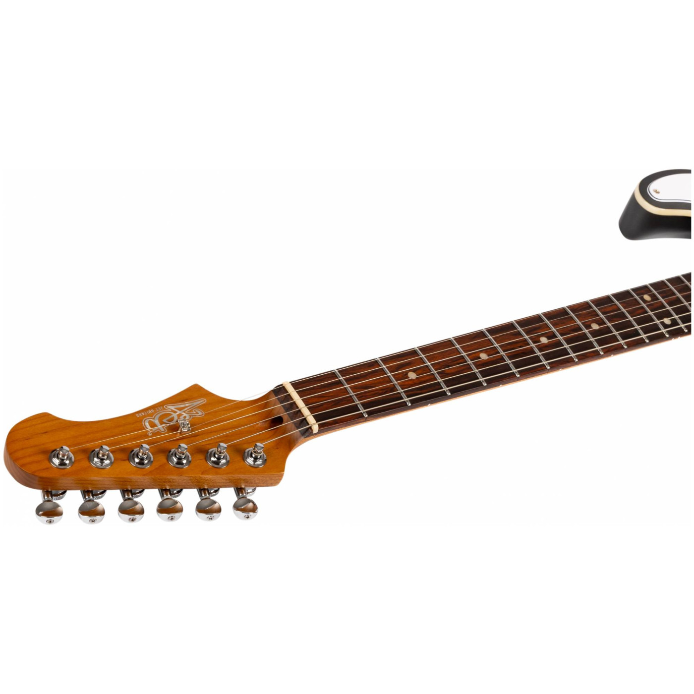 Гриф выполнен из печеного клена (roasted maple). При такой обработке поры дерева максимально сжимаются и в процессе использования вода уже не будет выходить, гриф не сожмется и лады не повылазят вне зависимости от влажности и смены температуры. Плюс такое дерево выглядит очень красиво. Накладка на гриф выполнена из палисандра.