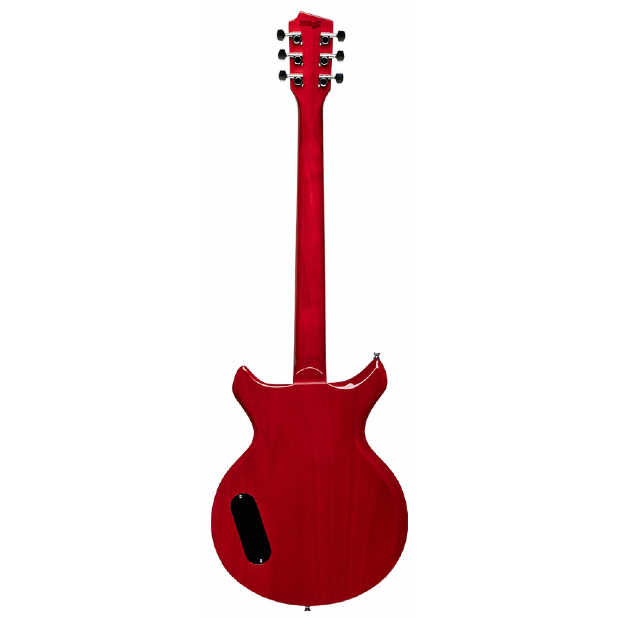Электрогитара STAGG SVY DC TCH выполнена в корпусе из цельного красного дерева типа Les Paul с двумя вырезами. Гриф вклеенный сделан из красного дерева с глянцевой отделкой, накладка на гриф – из черного дерева. У гитары 22 лада. Используются струны D’Addario.