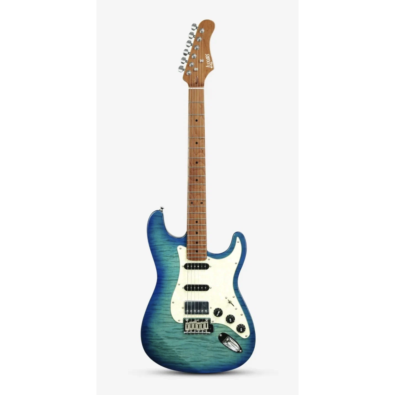 Электрогитара в цвете синий санберст. Модель сочетает классический дизайн с современными технологиями, подходит для разных музыкальных жанров