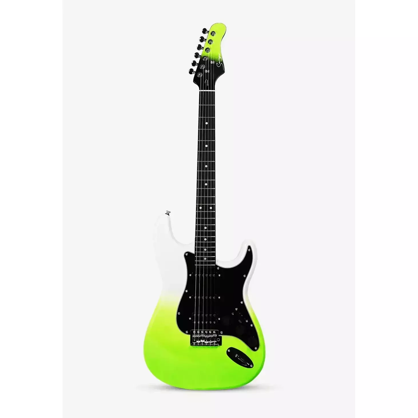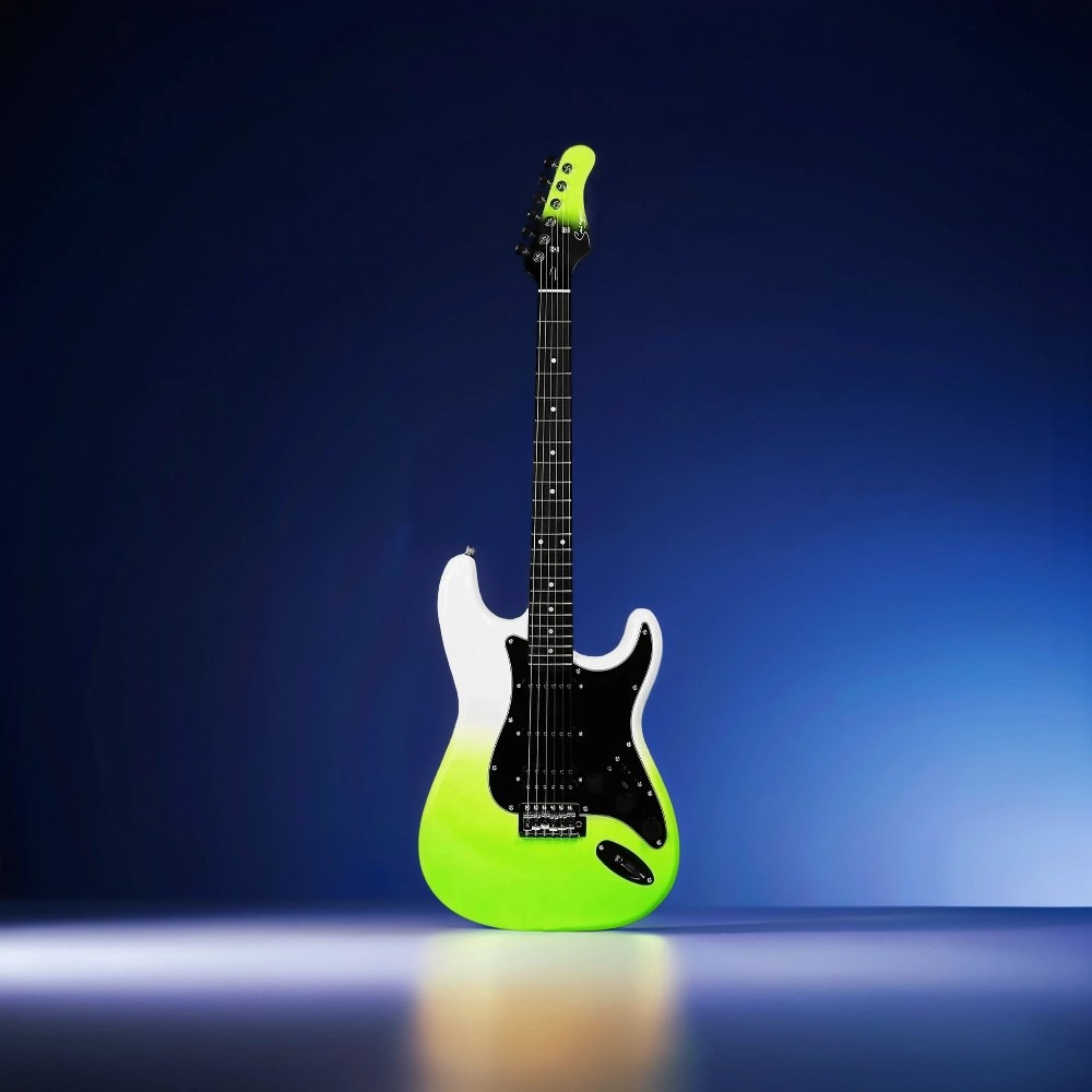 Это 6-струнная электрогитара в цвете «белый/зелёный», сочетающая баланс тона, играбельности и функциональности. Инструмент подходит для игры в разных стилях — от рока до блюза.