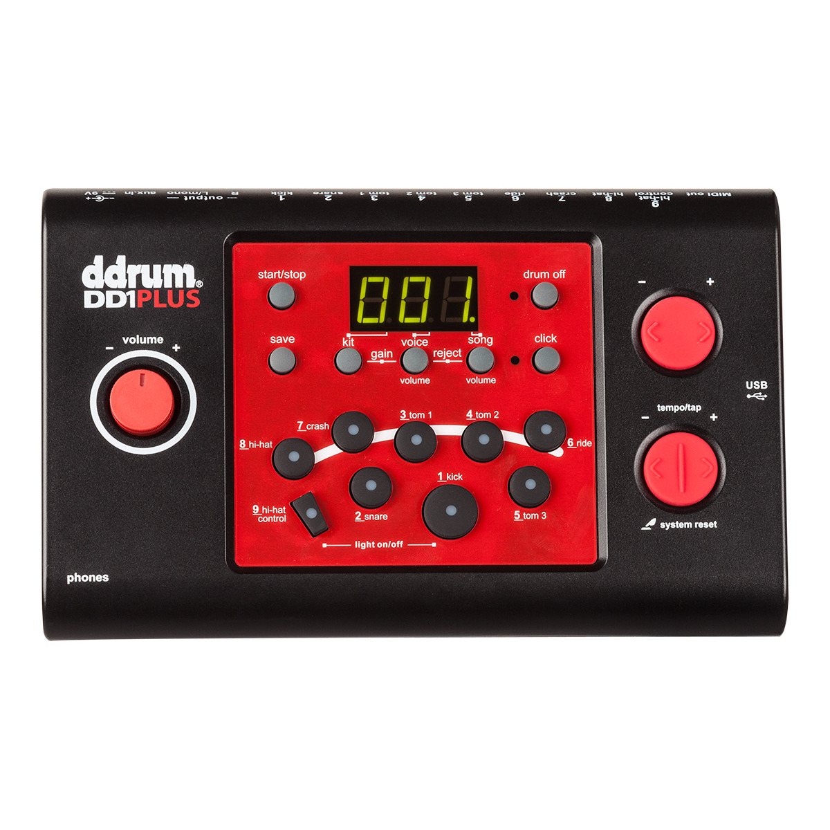 Ddrum DD1 PLUS электронная барабанная установка, состоит из модуля DD1M, 4-х однозонных барабанных пэдов, 3-х тарелочных пэдов, вертикального пэда бас-барабана с педалью, педали хета, барабанного стенда, комплекта соединительных кабелей, барабанных палочек.