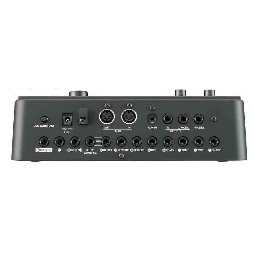 | Соединения | Разъемы USB TO DEVICE/TO HOST, OUTPUT [L/MONO] (стандартный моно разъем), OUTPUT [R] (стандартный моно разъем), Trigger Inputs 1 — 8, 11, (стандартный стерео разъем, L: триггерный вход, R: переключатель обода), триггерные входы 9, 10, (стандартный стерео разъем, L: триггерный вход, R: триггерный вход), КОНТРОЛЬ ХАЙ-ХЭТА (стандартный разъем), AUX IN (стерео мини-разъем), PHONES (стандартный стерео разъем), MIDI IN/OUT |