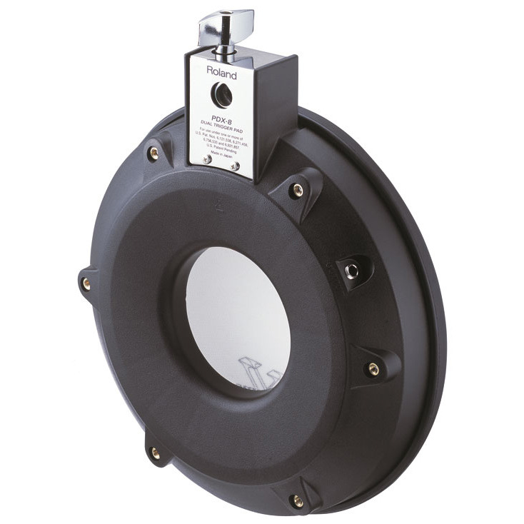 Новая модель V-пэда ROLAND PDX-8 с пластиком имеет диаметр 10 дюймов, более комфортабельна и менее шумная. При этом, сохранено традиционное раздельное срабатывание триггера пластика и обода.