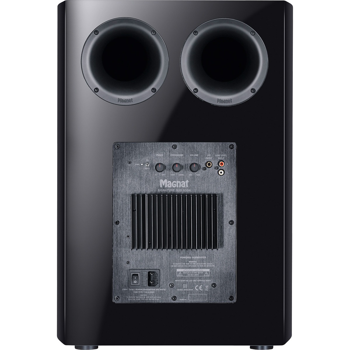 Активный сабвуфер Magnat Signature Sub 930A с цифровым усилителем и высокой мощностью идеально дополняет семейство Signature 900. Шасси в формате XXL и цифровой усилитель с пиковой мощностью 400 Вт позволяют активному сабвуферу Magnat Signature Sub 930A воспроизводить очень низкие частоты вплоть до 18 Гц. Массивный корпус Magnat Signature Sub 930A сработан из толстых листов MDF и стянут изнутри рёбрами жёсткости, при этом толщина фронтальной панели достигает 45 мм. 12-дюймовый драйвер с бумажным диффузором смонтирован на передней плоскости и излучает оптимально рассеивающую басовую энергию. Для повышения отдачи здесь использована схема с парой задних фазоинверторов сравнительно небольшого диаметра. Это решение позволило значительно уменьшить турбулентные воздушные шумы, возникающие на высокой громкости. Параметры усилительной части таковы — до 440 Вт в пике при схеме мягкого ограничения хода диффузора, эффективно устраняющей посторонние призвуки. Сабвуфер наделён обширным набором коммутационных разъёмов, в числе которых линейные и высокоуровневые терминалы, а также гнездо LFE для работы в кинотеатральном комплексе.