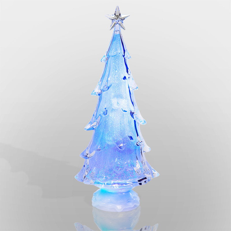 Фигура на подставке «Елочка со звездой» высотой 37 см станет великолепным украшением интерьера, который погрузит вас в атмосферу волшебной зимней сказки и подарит веселое праздничное настроение. Настольный декор выполнен в виде объемной новогодней ели, увенчанной звездой. Материал изготовления — прочный прозрачный пластик. В нижней части устойчивой подставки располагаются батарейный блок для 4 элементов питания типа ААА и удобная клавиша включения, выключения подсветки. Один экономичный светодиод RGB светится разными цветами, плавно меняя оттенки.