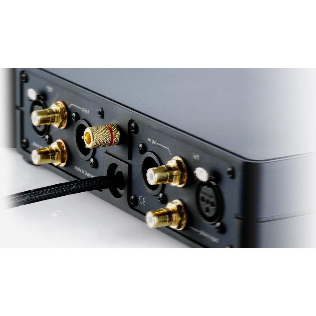 На тыльной панели основного модуля фонокорректора присутствуют балансный (XLR) и небалансный (RCA) входы, которые дублируются аналогичными выходами. Разъемы RCA обладают позолоченными контактными поверхностями. Для выбора между симметричным и несимметричным подключением имеется соответствующий селектор, расположенный на дне корпуса, а организовать заземление помогает позолоченная клемма.
