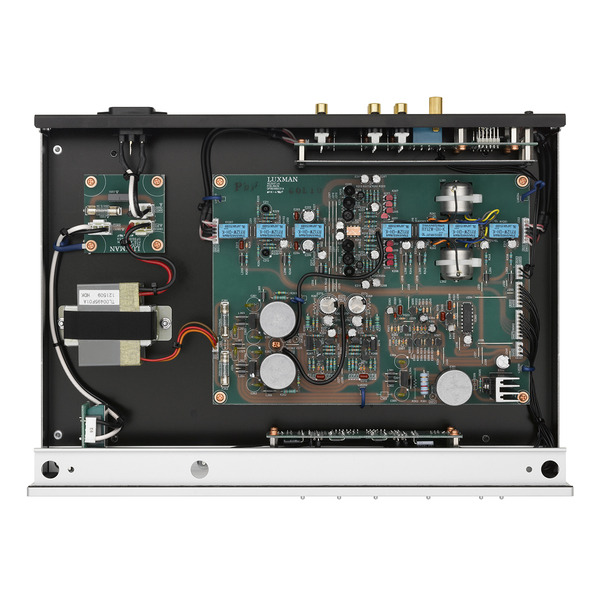 В Luxman E-250 применяется схема RIAA-коррекции NF-типа, которая использует отрицательную обратную связь и обеспечивает высокий показатель соотношения сигнал/шум. Работу по усилению сигнала MC-картриджей выполняют повышающие трансформаторы, оснащенные сердечниками из сплава супер-пермаллой. При этом переключатель на фронтальной панели позволяет выбрать один из двух вариантов коэффициента усиления и входного сопротивления для MC-головок: 57 дБ/40 Ом или 66 дБ/2,5 Ом. На фасаде корпуса также имеются переключатели выбора режимов моно/стерео, активации рокот-фильтра Low Cut (отсекает инфранизкие частоты и устраняет гул), включения режима размагничивания картриджей и MC-трансформаторов (Articulator), селектора входов и выбора типа головки звукоснимателя (MC или MM). В тыльную панель помимо DIP-переключателей встроен один выход RCA и два несимметричных входа, что удобно, к примеру, при подключении двух виниловых проигрывателей с разными типами картриджей или одной вертушки с двумя тонармами. Там же находится заземляющая клемма.