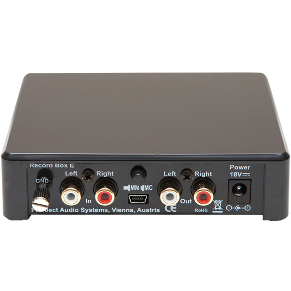 Для выбора типа подключенного звукоснимателя на задней панели Pro-Ject Record Box E предусмотрен специальный переключатель, а входные и выходные RCA-гнезда имеют позолоченные контактные поверхности. Кроме функции фонокорректора, устройство можно использовать и для оцифровки аналоговых записей на винили с целью их архивации на жестком диске компьютера. Для этой цели Record Box E имеет встроенный АЦП на базе микросхемы BurrBrown PCM2904, а подсоединение к ПК (PC или Mac) осуществляется через гнездо mini-USB. Никакие специальные драйвера на компьютер для этого устанавливать не требуется, а сама запись осуществляется с помощью популярных программ, в том числе и бесплатных, которые можно свободно скачать в Интернете.
