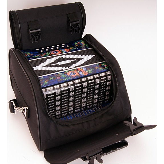 Гармонь Шуйская SZ48XL-C-BL – инструмент от одноименной российской компании. Это двухголосая гармонь без регистра со звукорядом на базе неполной хроматической гаммы. Голосовые планки выполнены из кускового алюминия, а голоса - из стали. На правой клавиатуре есть 19 пуговичных клавиш, расположенных в два ряда, а на левой - 12 кнопок в два ряда. Резонаторы инструмента изготовлены из древесины лиственных и хвойных пород с лакированным покрытием. Корпус гармони выполнен из клеевой березовой фанеры с целлулоидной облицовкой. Передние стенки корпуса украшены орнаментом-росписью. Правая и левая сетки сделаны из алюминиевых листов с нитроэмалевым покрытием черного цвета. Меховая камера выполнена из картона, оклеена хлопчатобумажной тканью и имеет 17 рабочих борин, а меховые углы сделаны из латуни.