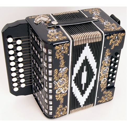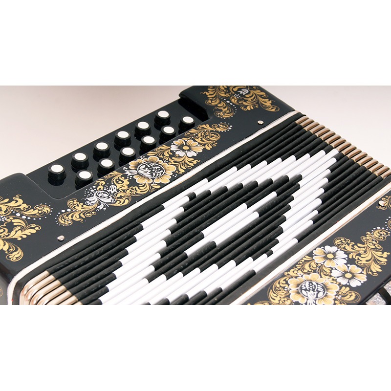 Гармонь Шуйская SZ48XL-G-BLACK 19х12-II - инструмент от одноименной российской компании. Это двухголосая гармонь без регистра со звукорядом на базе неполной хроматической гаммы. Голосовые планки выполнены из кускового алюминия, а голоса - из стали. На правой клавиатуре есть 19 пуговичных клавиш, расположенных в два ряда, а на левой - 12 кнопок в два ряда. Резонаторы сделаны из древесины лиственных и хвойных пород и покрыты лаком. Корпус выполнен из клеевой березовой фанеры и облицован целлулоидом. На передних стенках корпуса вы найдете орнамент-роспись. Правая и левая сетки сделаны из алюминиевых листов и покрыты черной нитроэмалью. Меховая камера выполнена из картона, оклеена хлопчатобумажной тканью и имеет 17 рабочих борин, а меховые углы сделаны из латуни.