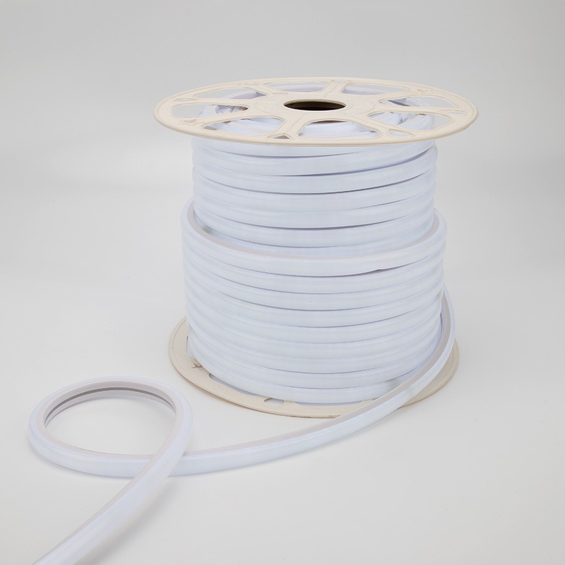 Гибкий неон – это световой шнур, выполненный из матовой полимерной трубки, наполненной ПВХ, со светодиодной лентой внутри. Используется для рекламной, декоративной и архитектурной подсветки различных объектов, зданий, сооружений, декорирования офисного или домашнего интерьера. Данный неон выполнен на SMD светодиодах белого цвета. Выполнен в форме «D», что значительно расширяет угол свечения и спектр применения изделия. При подключении гибкого неона к соединительному разъему (муфте) необходимо заизолировать свободное воздушное пространство соединительного разъема (муфты) морозостойким силиконовым герметиком, предотвращающим попадание влаги. Сверху данного соединения необходимо использовать термоусаживаемую трубку.