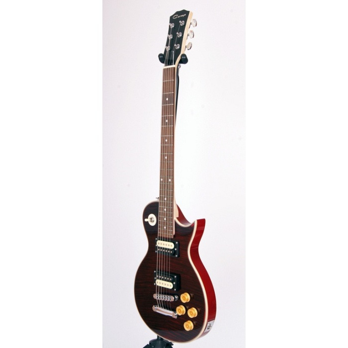Цвет: красный санберст. Шестиструнная гитара с корпусом типа «Les Paul» из древесины твердых пород. Без защитной накладки. Гриф изготовлен из клена, накладка грифа из палисандра. Мензура - 648 мм, 22 лада из сплава меди и никеля. Хромированная колковая механика. Колки расположены в два ряда. Гитара имеет четыре регулятора: два громкости, два тембра и трехпозиционный переключатель. Бридж - Tune-o-matic со стоп-баром. Два сингл звукоснимателя. Принцип звучания электрогитары основан на получении сигнала с помощью магнитных звукоснимателей, преобразующих механические колебания металлических струн в электрические импульсы, используя явление магнитной индукции. После чего сигнал усиливается в усилителе и воспроизводится в комбиках или акустических системах. Магнитный звукосниматель был изобретен в 1924 году Ллойдом Лоэром, звукоинженером компании Gibson. Первой электрогитарой стала так называемая «Сковородка», изготовленная Жоржем Бишампом в 1931 году из алюминия.