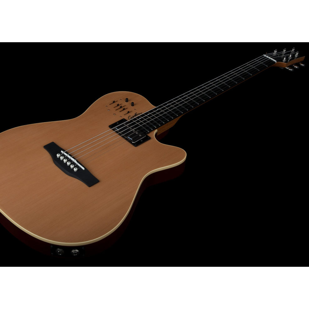 Все эти особенности усилены в гитаре A6 Ultra с установленным в нековую позицию хамбакера Godin, звукоснимателем под нижним порожком, двумя выходами и электроникой, разработанной специально для этой модели. Предусилитель позволяет контролировать звучание с помощью ползунков, отдельно для хамбакера и акустического звукоснимателя.