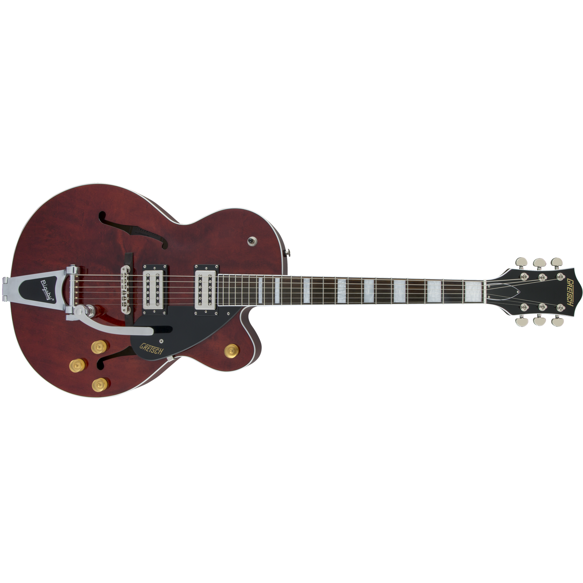 Gretsch G2420T Streamliner™ Hollow Body – современная электрогитара с полым корпусом, специально созданная для гитаристов, которые всегда стремятся к большему. Модель выполнена из высококачественных материалов и комплектующих, она элегантно выглядит, оснащена улучшенной электроникой и выдаёт великолепный узнаваемый звук Gretsch. Особенность представленной модели Streamliner – это новейшие хамбакеры Broad'Tron™ собственной разработки инженеров Gretsch, сконструированные специально для этой гитары. Broad'Tron - это звукосниматель с высоким выходным уровнем, выдающий уникальный звук благодаря сочетанию мощных густых низов, чистых и прозрачных верхних частот, хрипловатой середины. Переключатель – 3-позиционный. В дополнение к регуляторам тембра и общего уровня громкости предусмотрены отдельные регуляторы громкости для каждого из звукоснимателей. Полый корпус гитары формы Streamliner глубиной 70 миллиметров с одним удобным вырезом выполнен из ламинированного клена. Гриф удобного для быстрой игры профиля Thin "U" – из древесины нато, с глянцевой отделкой и белой окантовкой. Мензура – 629 мм (24.75 дюйма). Накладка – палисандровая, радиус – 12 дюймов (305 мм). На грифе 22 лада Medium Jumbo с инкрустацией перламутровыми прямоугольниками. Порожек выполнен из искусственной кости. Палисандровый бридж Adjusto-matic™ обеспечивает надежность строя, а тремоло Bigsby B60 даёт широкие возможности для экспрессивной игры. Инструмент элегантно выглядит в изящном полом корпусе с винтажными золотыми регуляторами, двухслойной черно-белой окантовкой корпуса, обтекаемой никелированной фурнитурой и черным пикгардом с логотипом Gretsch. Модель представлена в красивом ореховом цвете.