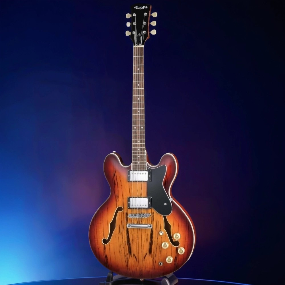 Корпус полуакустической гитары ROOT NOTE ES601 изготовлен из клена, с топом из волнистого клена, гриф тоже кленовый, с накладкой из лавра. Инструмент имеет стандартную 648 мм мензуру. За формирование звука отвечают два хамбакера с магнитами алнико, два регулятора громкости, два регулятора тона и 3-позиционный переключатель звукоснимателей. На гитаре установлена качественная хромированная колковая механика и надежный струнодержатель Tune-o-Matic.