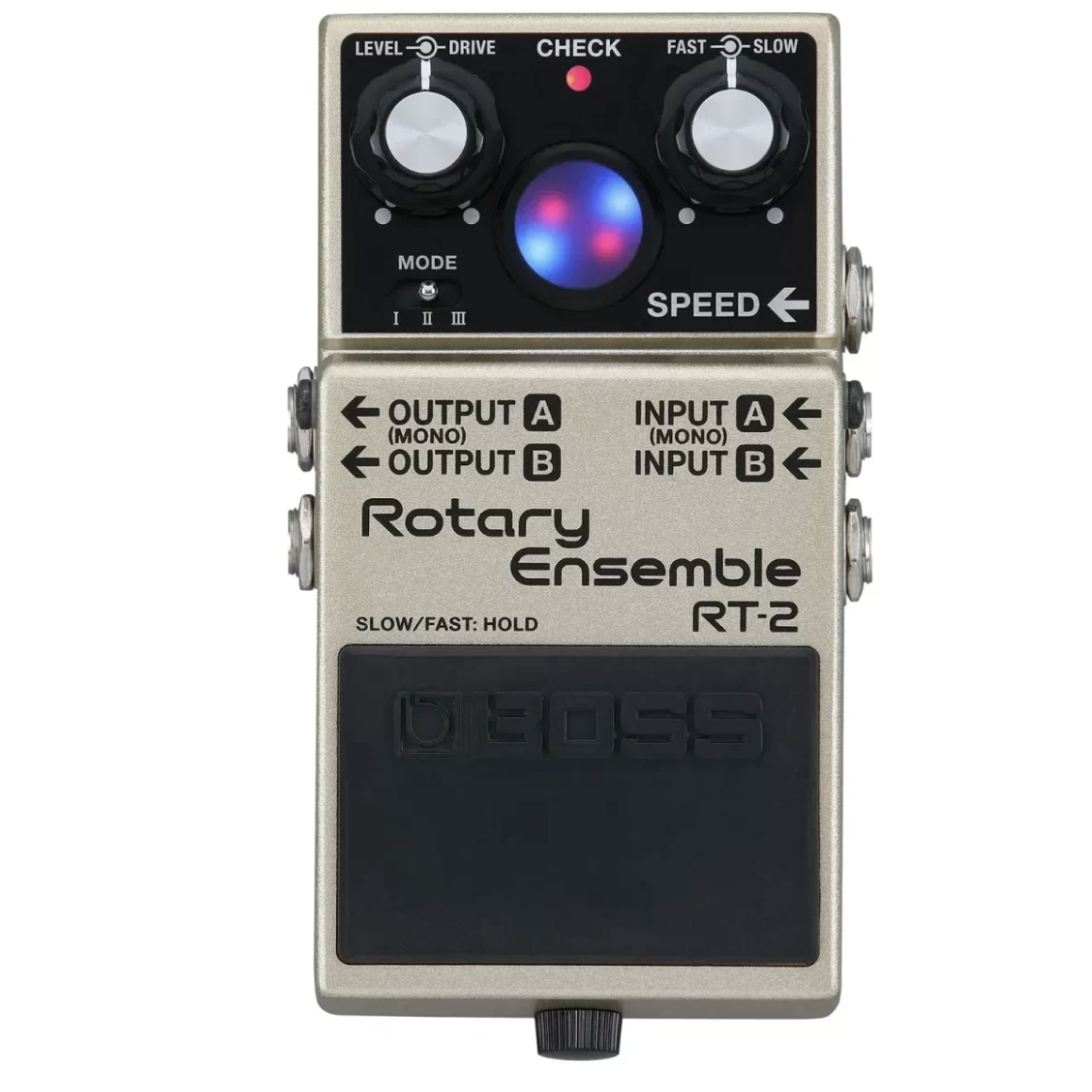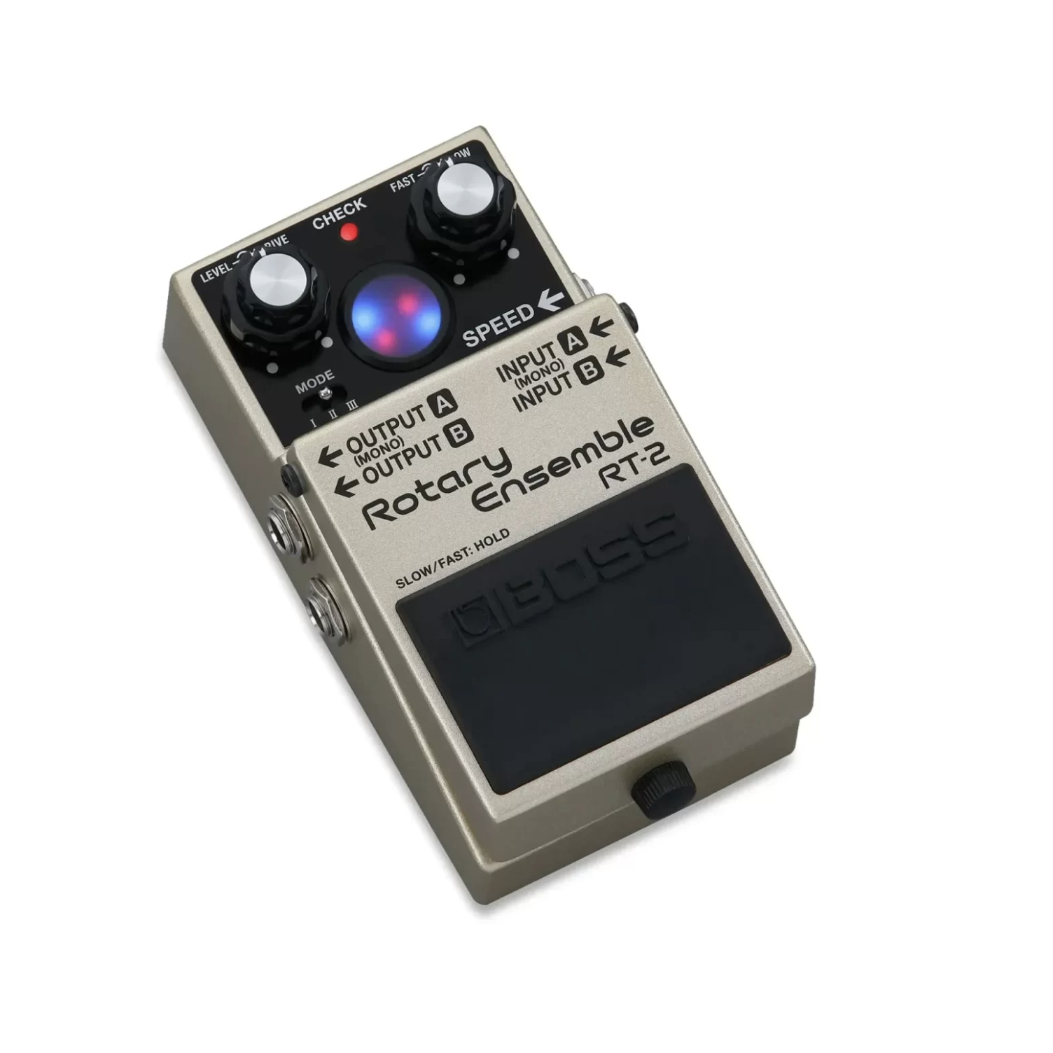Boss RT-2 Rotary Ensemble — компактная педаль, предназначенная для имитации звука вращающегося динамика. Она предлагает три режима вращения: классический, модернизированный и современный, позволяя пользователю выбирать между традиционным и современным звучанием. Педаль оснащена виртуальным индикатором вращения, который отображает скорость высокочастотного и низкочастотного роторов, а также имеет регуляторы уровня, драйва и скорости вращения. Дополнительно предусмотрены переключатели для настройки баланса драйва и времени подъема/спада. Педаль поддерживает подключение внешних переключателей для управления различными функциями и имеет стерео-входы и выходы. Питание осуществляется от адаптера 9 В постоянного тока.